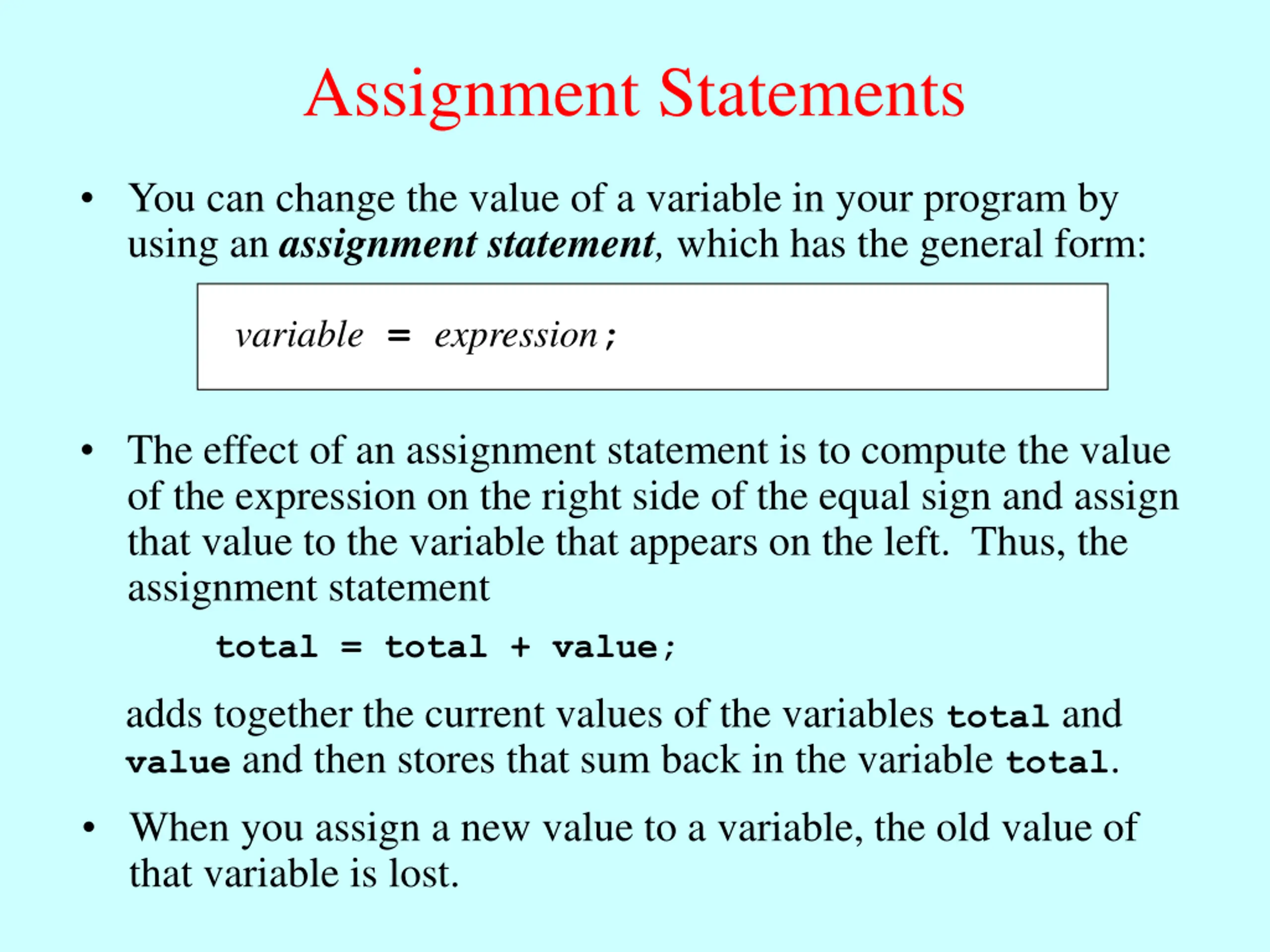 Assignment Statements You can change the value of a variable in your program by using an assignment statement, which has the general form: variable = expression; The effect of an assignment statement is to compute the value of the expression on the right side of the equal sign and assign that value to the variable that appears on the left. Thus, the assignment statement total = total + value; adds together the current values of the variables total and value and then stores that sum back in the variable total. When you assign a new value to a variable, the old value of that variable is lost.