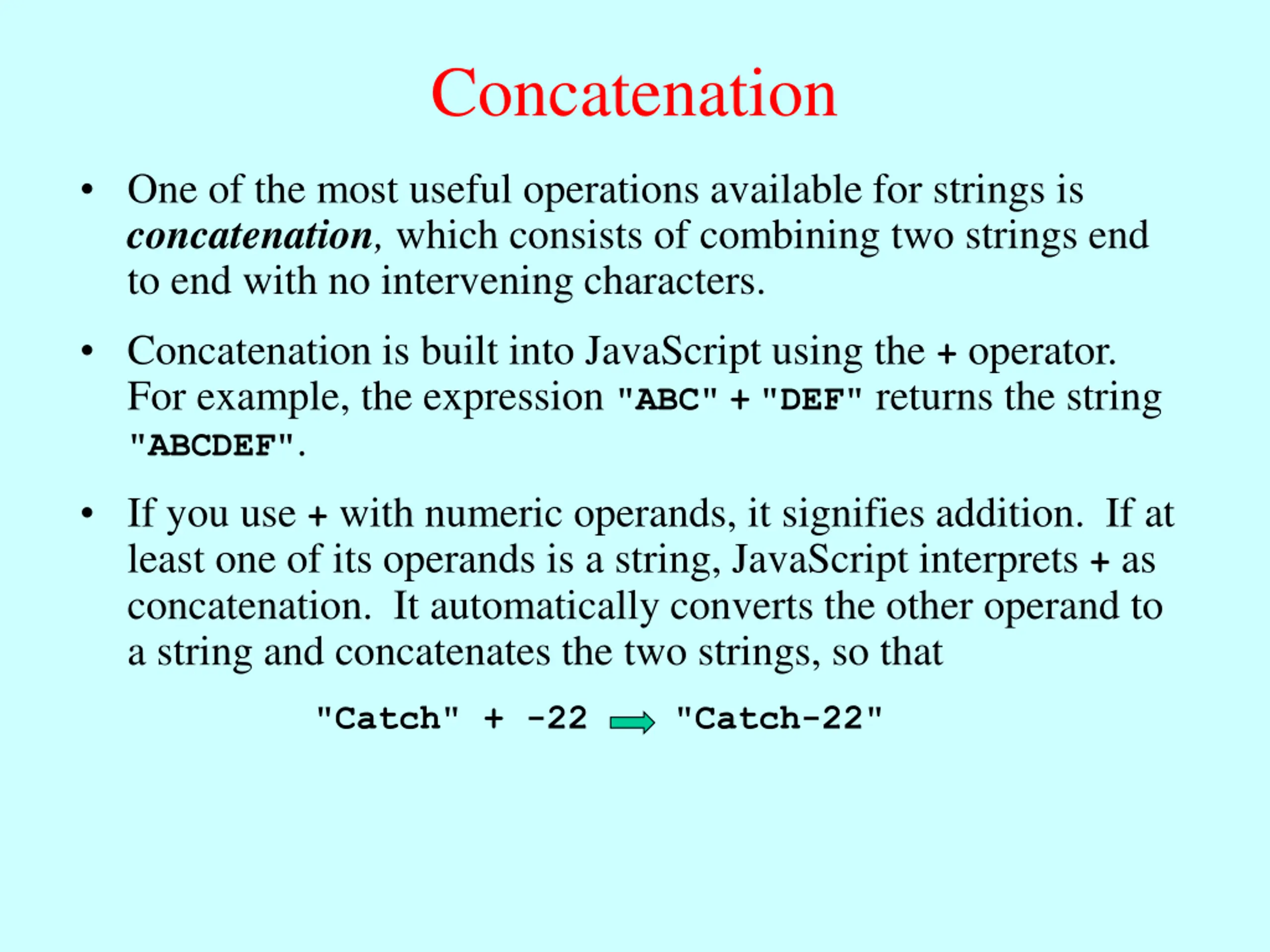 Concatenation One of the most useful operations available for strings is concatenation, which consists of combining two strings end to end with no intervening characters. Concatenation is built into JavaScript using the + operator. For example, the expression "ABC"+"DEF" returns the string "ABCDEF". If you use + with numeric operands, it signifies addition. If at least one of its operands is a string, JavaScript interprets + as concatenation. It automatically converts the other operand to a string and concatenates the two strings, so that "Catch" + -22 "Catch-22"