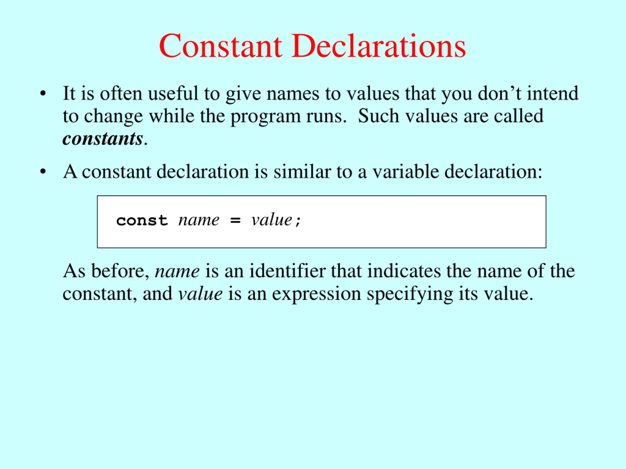 Constant Declarations It is often useful to give names to values that you don t intend to change while the program runs. Such values are called constants. A constant declaration is similar to a variable declaration: const name = value; As before, name is an identifier that indicates the name of the constant, and value is an expression specifying its value.