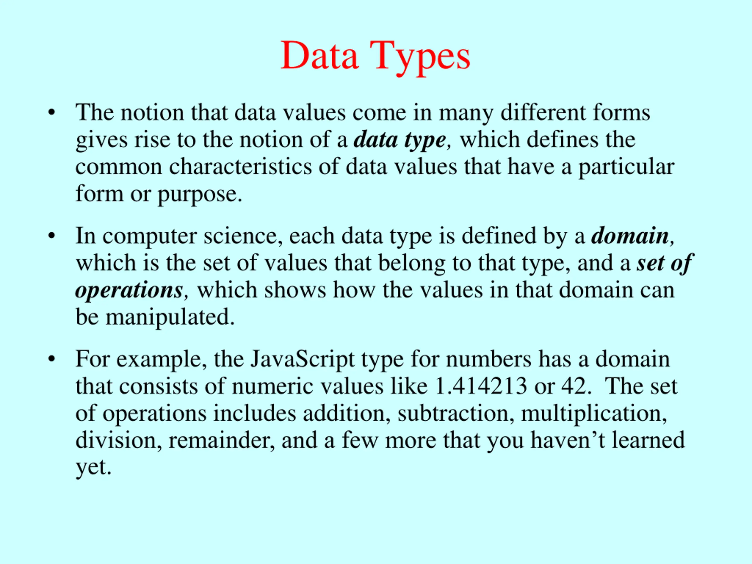 Data Types The notion that data values come in many different forms gives rise to the notion of a data type, which defines the common characteristics of data values that have a particular form or purpose. In computer science, each data type is defined by a domain, which is the set of values that belong to that type, and a set of operations, which shows how the values in that domain can be manipulated. For example, the JavaScript type for numbers has a domain that consists of numeric values like 1.414213 or 42. The set of operations includes addition, subtraction, multiplication, division, remainder, and a few more that you haven t learned yet.