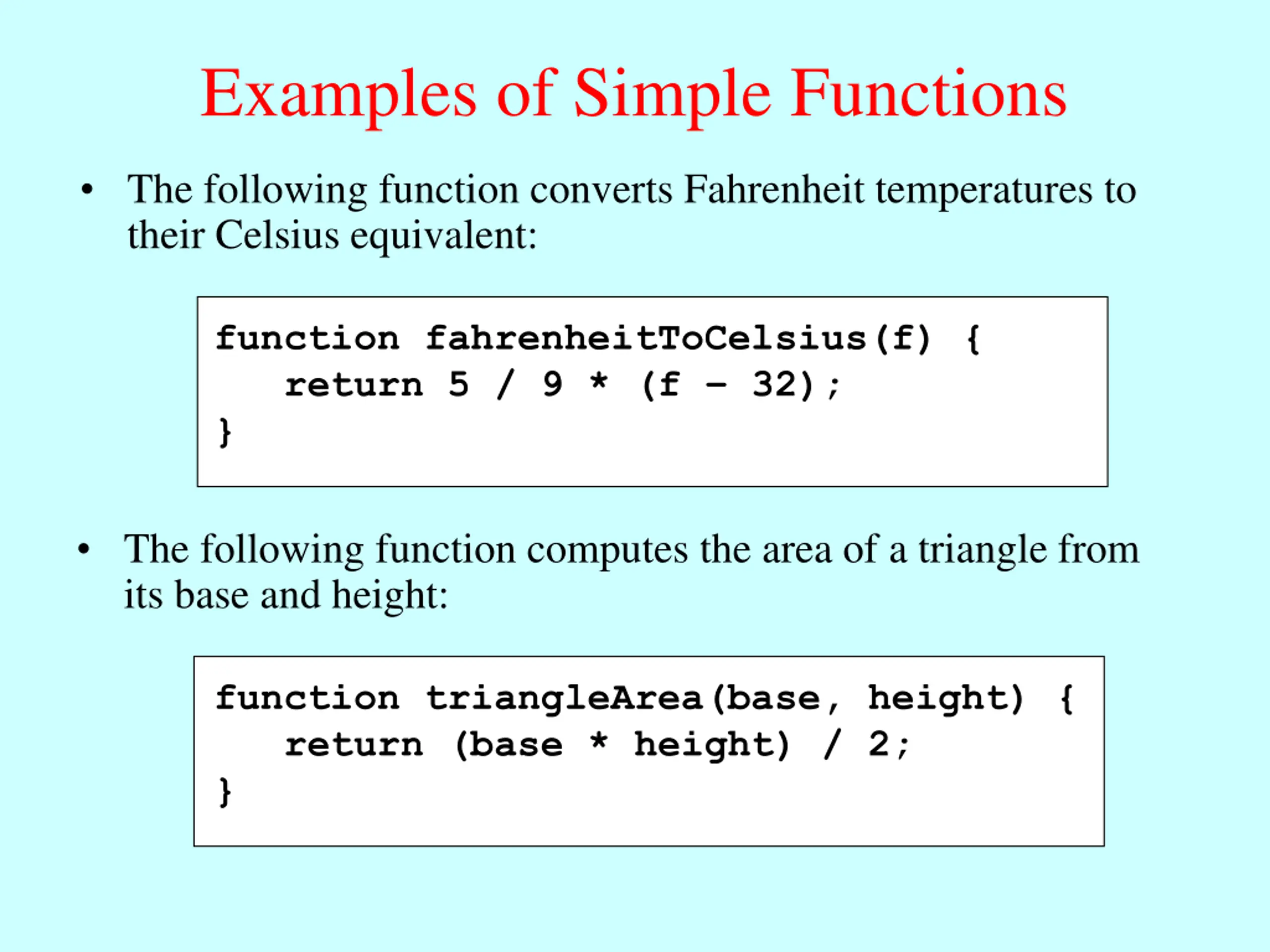 Examples of Simple Functions The following function converts Fahrenheit temperatures to their Celsius equivalent: function fahrenheitToCelsius(f) { return 5 / 9 * (f 32); } The following function computes the area of a triangle from its base and height: function triangleArea(base, height) { return (base * height) / 2; }