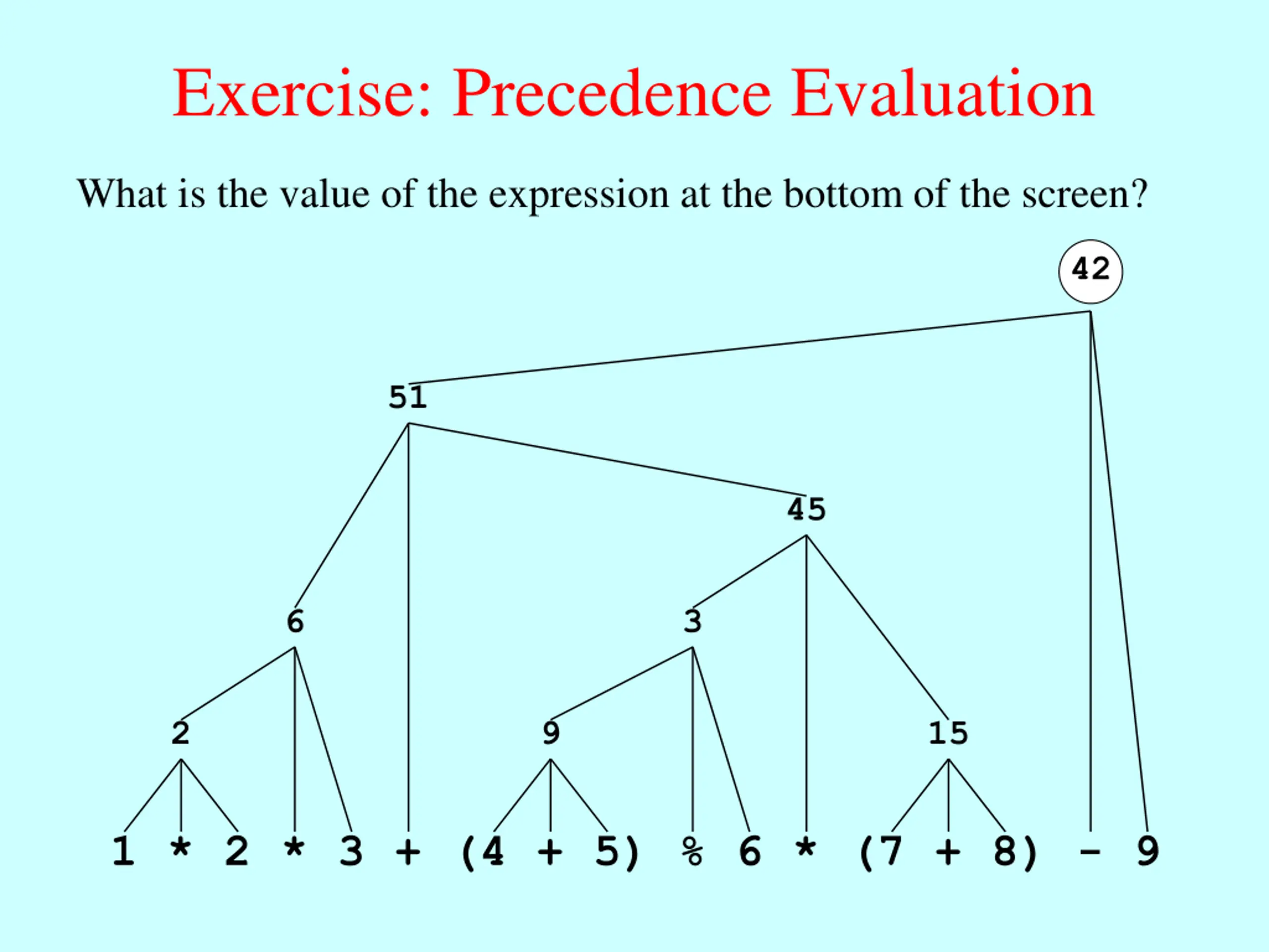 Exercise: Precedence Evaluation What is the value of the expression at the bottom of the screen? 42 51 45 6 3 2 9 15 1 * 2 * 3 + ( 4 + 5 ) % 6 * ( 7 + 8 ) - 9