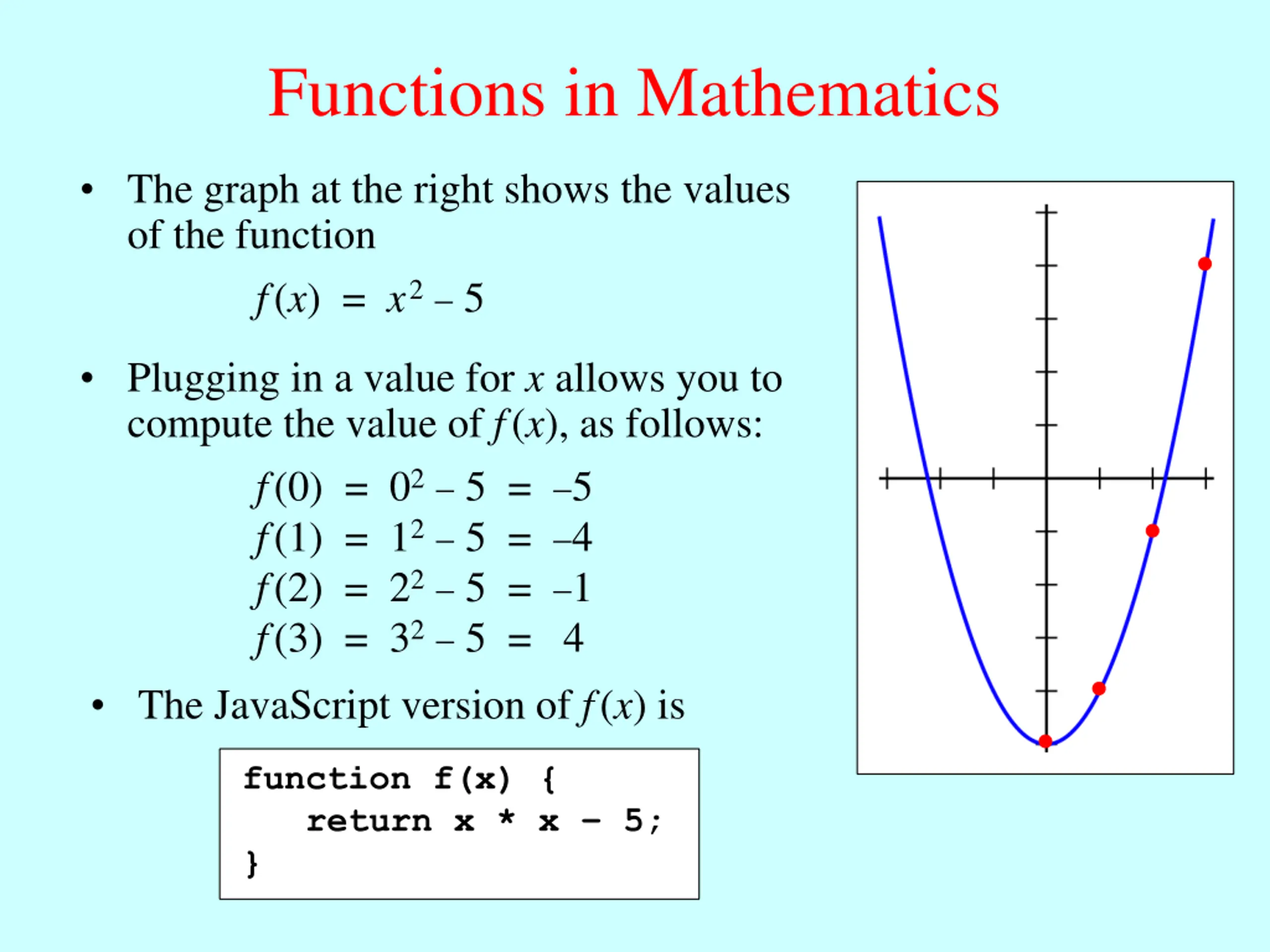 Functions in Mathematics The graph at the right shows the values of the function f(x) = x2 5 Plugging in a value for x allows you to compute the value of f(x), as follows: f(0) = 02 5 = 5 f(1) = 12 5 = 4 f(2) = 22 5 = 1 f(3) = 32 5 = 4 The JavaScript version of f(x) is function f(x) { return x * x 5; }