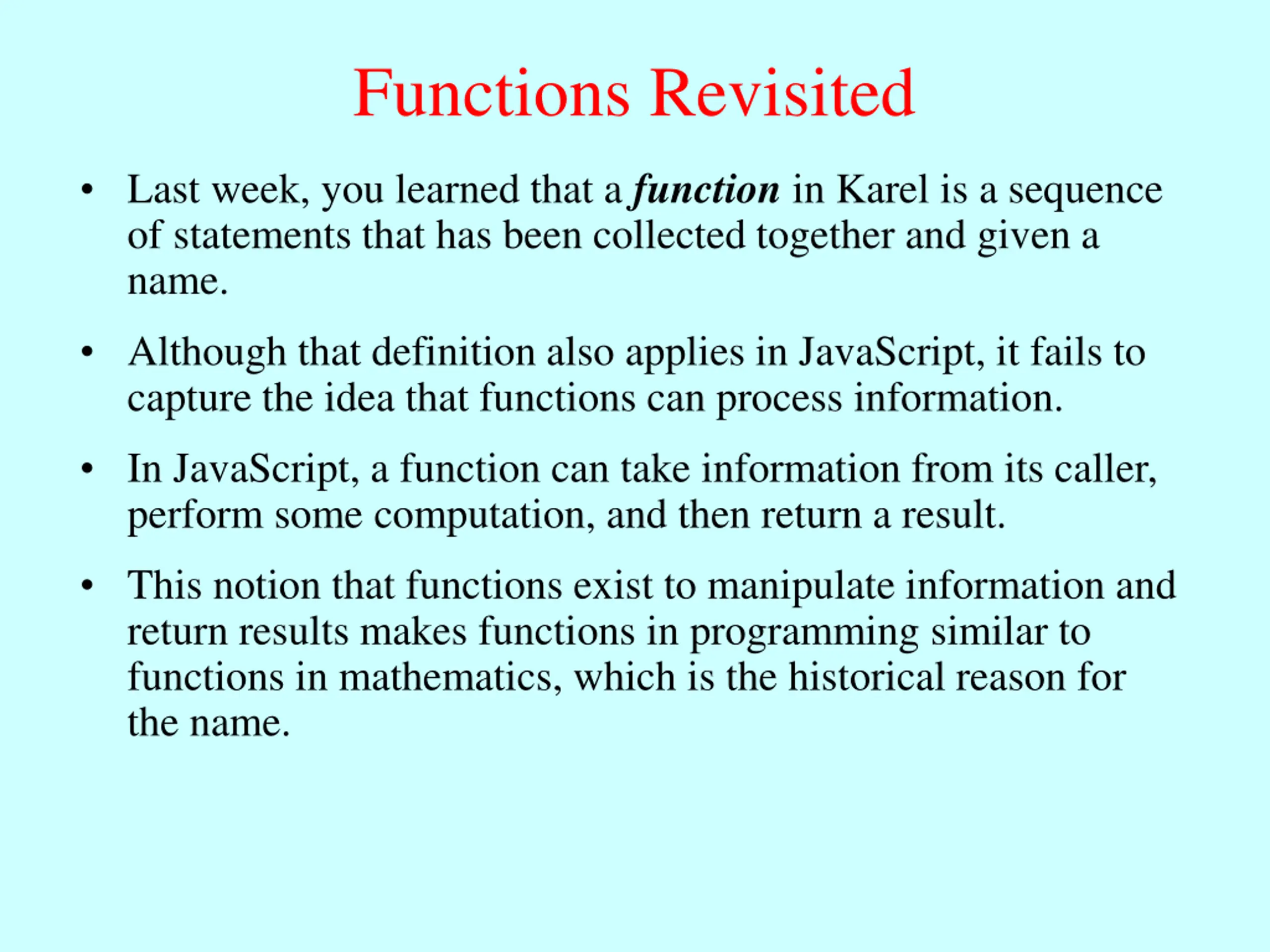 Functions Revisited Last week, you learned that a function in Karel is a sequence of statements that has been collected together and given a name. Although that definition also applies in JavaScript, it fails to capture the idea that functions can process information. In JavaScript, a function can take information from its caller, perform some computation, and then return a result. This notion that functions exist to manipulate information and return results makes functions in programming similar to functions in mathematics, which is the historical reason for the name.
