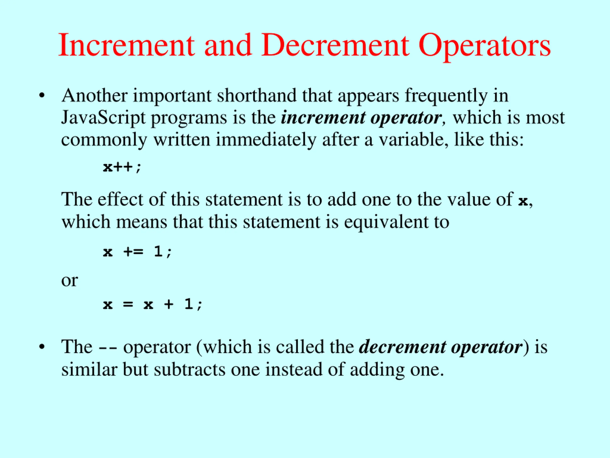 Increment and Decrement Operators Another important shorthand that appears frequently in JavaScript programs is the increment operator, which is most commonly written immediately after a variable, like this: x++; The effect of this statement is to add one to the value of x, which means that this statement is equivalent to x += 1; or x = x + 1; The -- operator (which is called the decrement operator) is similar but subtracts one instead of adding one.