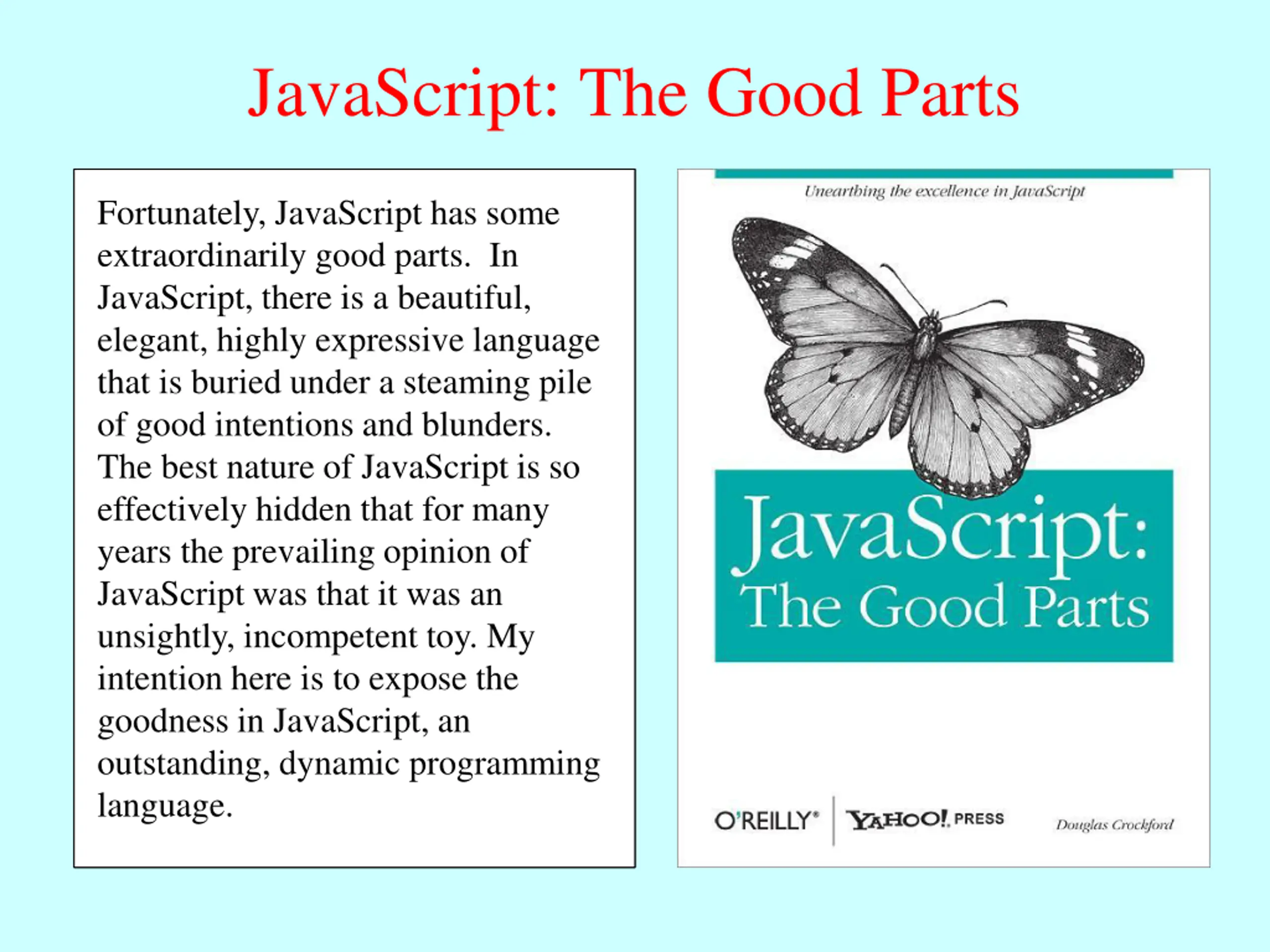 JavaScript: The Good Parts JavaScript is a language with more than its share of bad parts. It went from non-existence adoption in an alarmingly short period of time. It never had an interval in the lab when it could be tried out and polished. It went straight into Netscape Navigator 2 just as it was, and it was very rough. When Java JavaScript became the Language of the Web by default. JavaScript s popularity is almost completely independent of its qualities as a programming language. language. Fortunately, JavaScript has some extraordinarily good parts. In JavaScript, there is a beautiful, elegant, highly expressive language that is buried under a steaming pile of good intentions and blunders. The best nature of JavaScript is so effectively hidden that for many years the prevailing opinion of JavaScript was that it was an unsightly, incompetent toy. My intention here is to expose the goodness in JavaScript, an outstanding, dynamic programming to global applets failed,