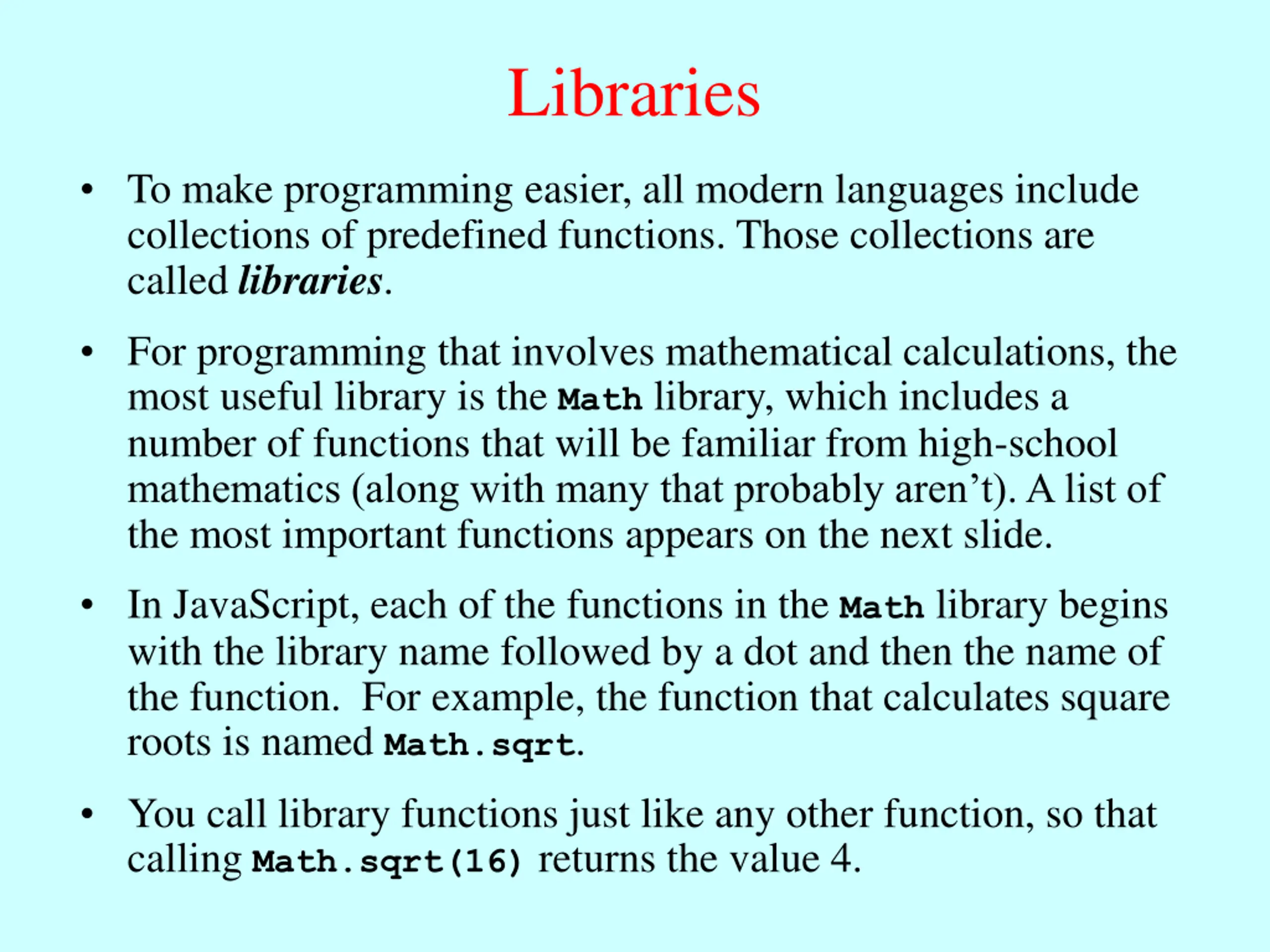 Libraries To make programming easier, all modern languages include collections of predefined functions. Those collections are called libraries. For programming that involves mathematical calculations, the most useful library is the Math library, which includes a number of functions that will be familiar from high-school mathematics (along with many that probably aren t). A list of the most important functions appears on the next slide. In JavaScript, each of the functions in the Math library begins with the library name followed by a dot and then the name of the function. For example, the function that calculates square roots is named Math.sqrt. You call library functions just like any other function, so that calling Math.sqrt(16) returns the value 4.