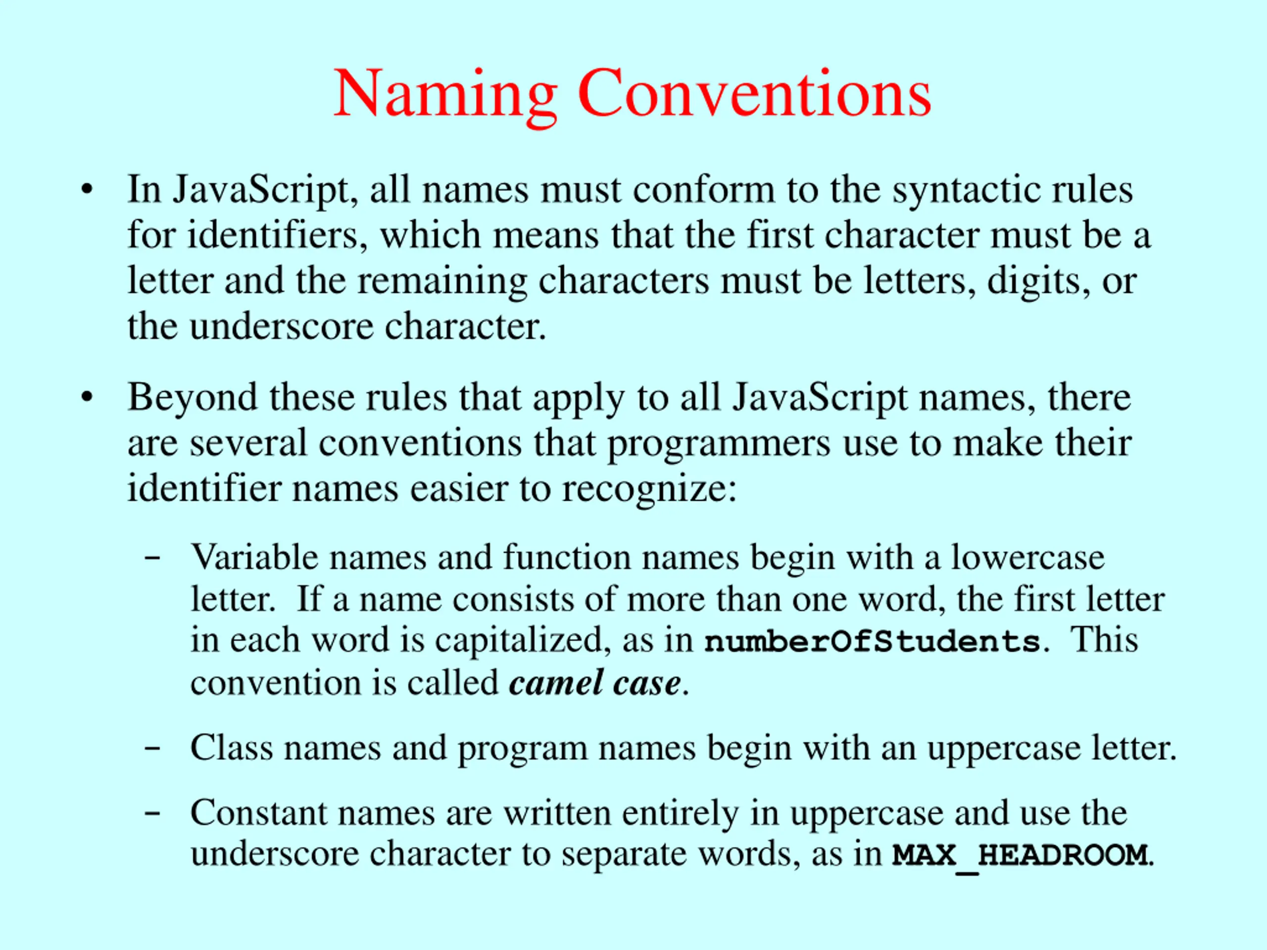 Naming Conventions In JavaScript, all names must conform to the syntactic rules for identifiers, which means that the first character must be a letter and the remaining characters must be letters, digits, or the underscore character. Beyond these rules that apply to all JavaScript names, there are several conventions that programmers use to make their identifier names easier to recognize: Variable names and function names begin with a lowercase letter. If a name consists of more than one word, the first letter in each word is capitalized, as in numberOfStudents. This convention is called camel case. Class names and program names begin with an uppercase letter. Constant names are written entirely in uppercase and use the underscore character to separate words, as in MAX_HEADROOM.