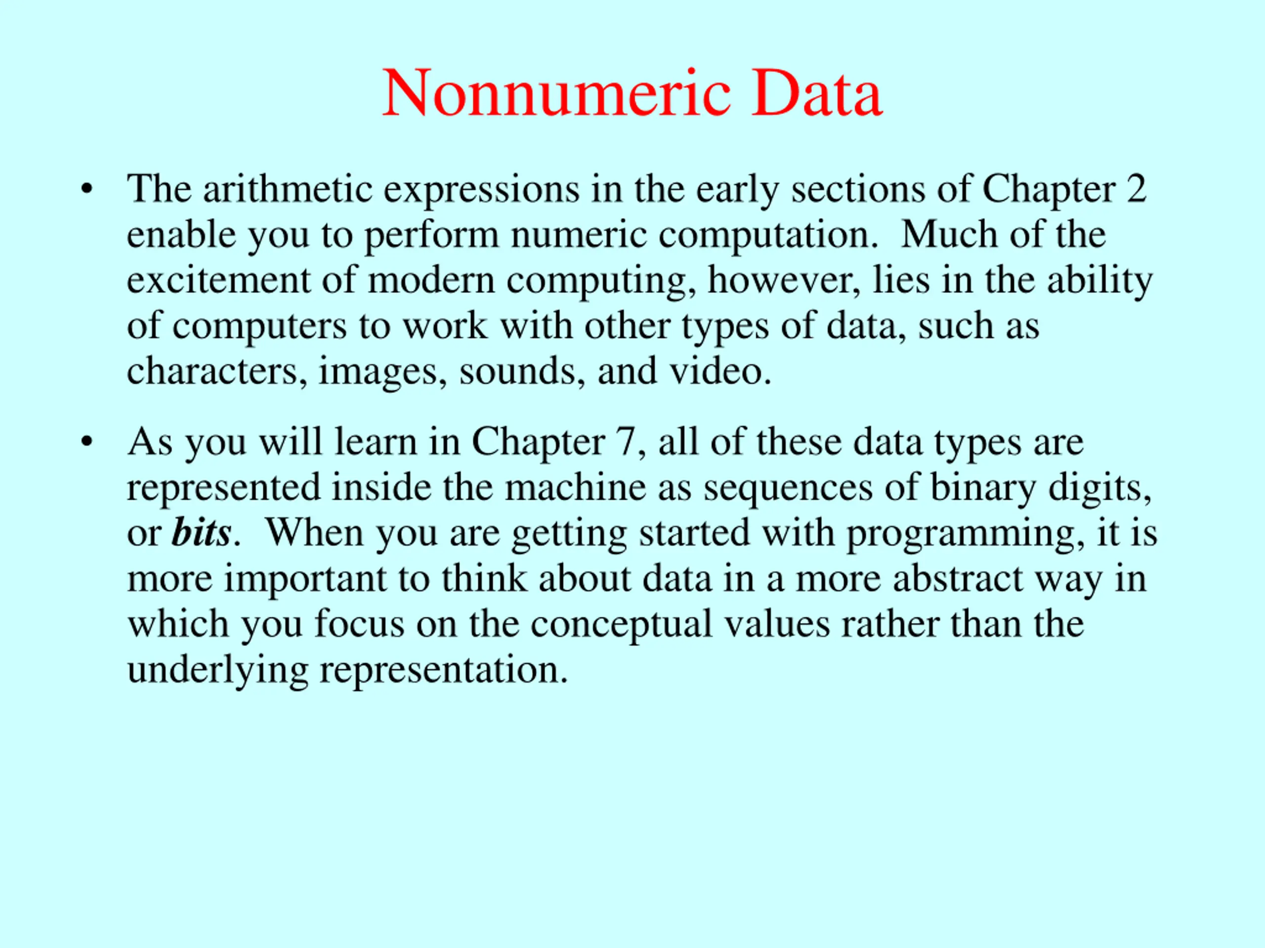 Nonnumeric Data The arithmetic expressions in the early sections of Chapter 2 enable you to perform numeric computation. Much of the excitement of modern computing, however, lies in the ability of computers to work with other types of data, such as characters, images, sounds, and video. As you will learn in Chapter 7, all of these data types are represented inside the machine as sequences of binary digits, or bits. When you are getting started with programming, it is more important to think about data in a more abstract way in which you focus on the conceptual values rather than the underlying representation.