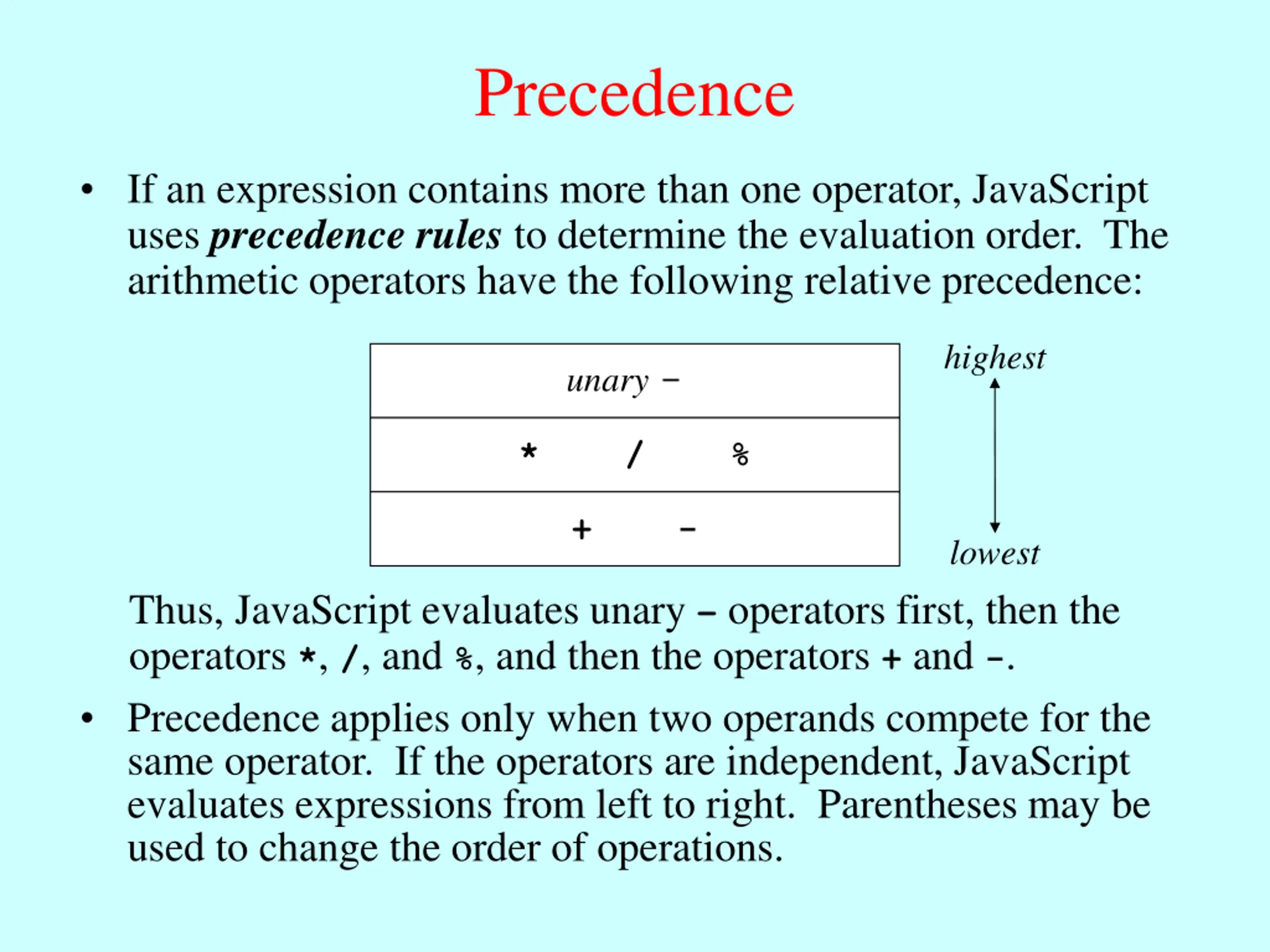 Precedence If an expression contains more than one operator, JavaScript uses precedence rules to determine the evaluation order. The arithmetic operators have the following relative precedence: highest unary- * / % + - lowest Thus, JavaScript evaluates unary operators first, then the operators *, /, and %, and then the operators + and -. Precedence applies only when two operands compete for the same operator. If the operators are independent, JavaScript evaluates expressions from left to right. Parentheses may be used to change the order of operations.