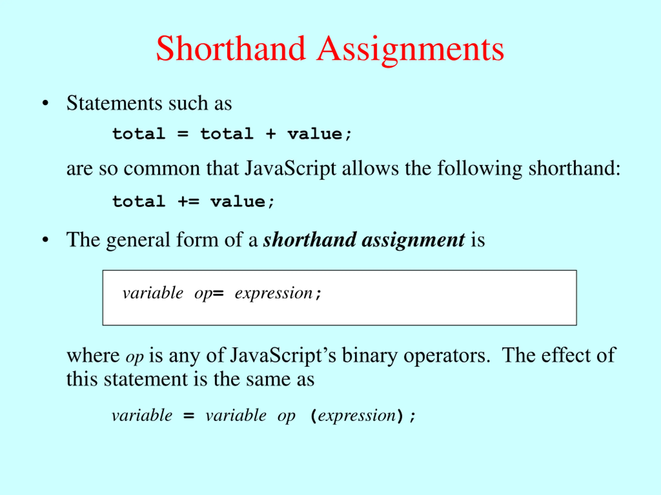 Shorthand Assignments Statements such as total = total + value; are so common that JavaScript allows the following shorthand: total += value; The general form of a shorthand assignment is variableop= expression; where opis any of JavaScript s binary operators. The effect of this statement is the same as variable = variableop (expression);