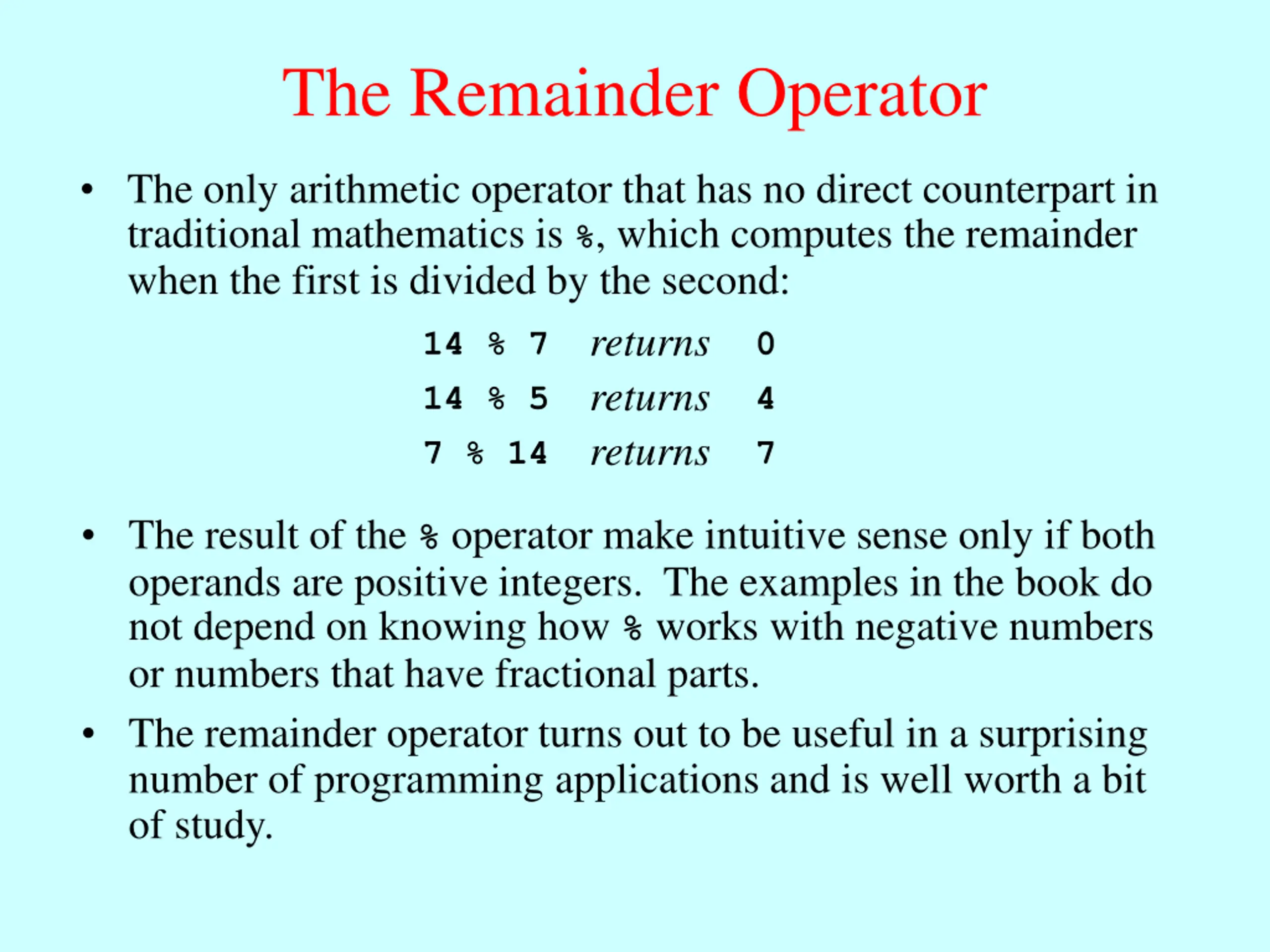 The Remainder Operator The only arithmetic operator that has no direct counterpart in traditional mathematics is %, which computes the remainder when the first is divided by the second: returns 14 % 5 returns 7 % 14 returns 14 % 7 0 4 7 The result of the % operator make intuitive sense only if both operands are positive integers. The examples in the book do not depend on knowing how % works with negative numbers or numbers that have fractional parts. The remainder operator turns out to be useful in a surprising number of programming applications and is well worth a bit of study.