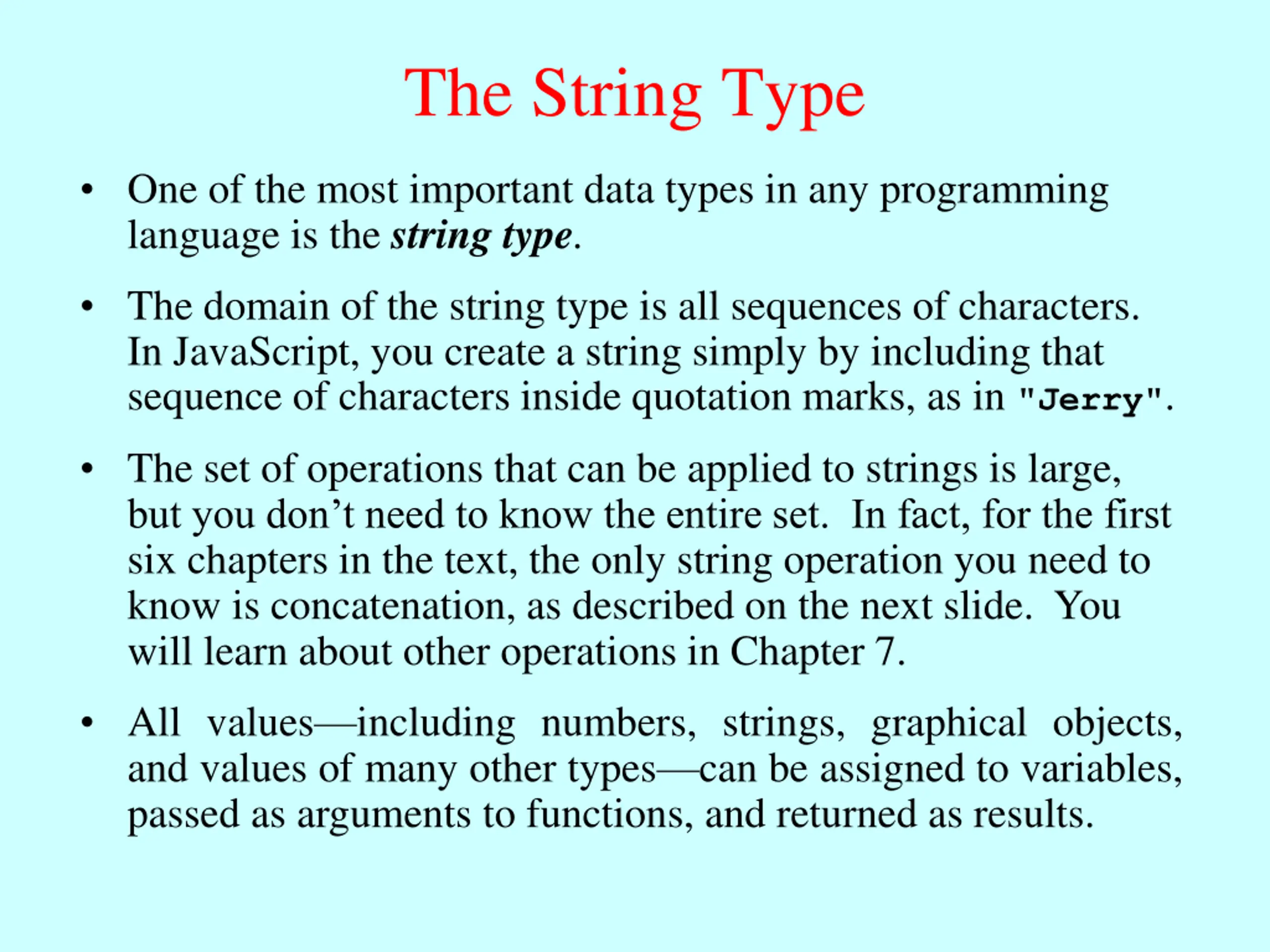 The String Type One of the most important data types in any programming language is the string type. The domain of the string type is all sequences of characters. In JavaScript, you create a string simply by including that sequence of characters inside quotation marks, as in "Jerry". The set of operations that can be applied to strings is large, but you don t need to know the entire set. In fact, for the first six chapters in the text, the only string operation you need to know is concatenation, as described on the next slide. You will learn about other operations in Chapter 7. All values including numbers, strings, graphical objects, and values of many other types can be assigned to variables, passed as arguments to functions, and returned as results.