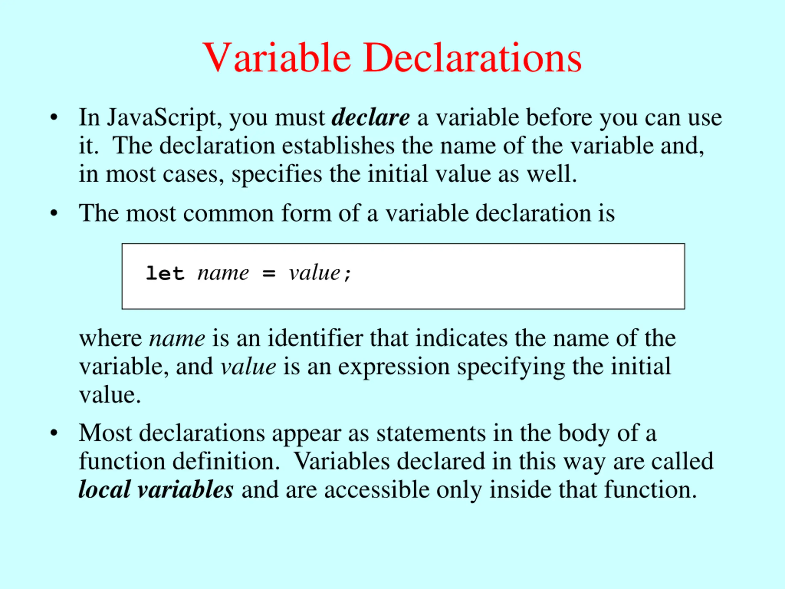 Variable Declarations In JavaScript, you must declare a variable before you can use it. The declaration establishes the name of the variable and, in most cases, specifies the initial value as well. The most common form of a variable declaration is let name = value; where name is an identifier that indicates the name of the variable, and value is an expression specifying the initial value. Most declarations appear as statements in the body of a function definition. Variables declared in this way are called local variables and are accessible only inside that function.