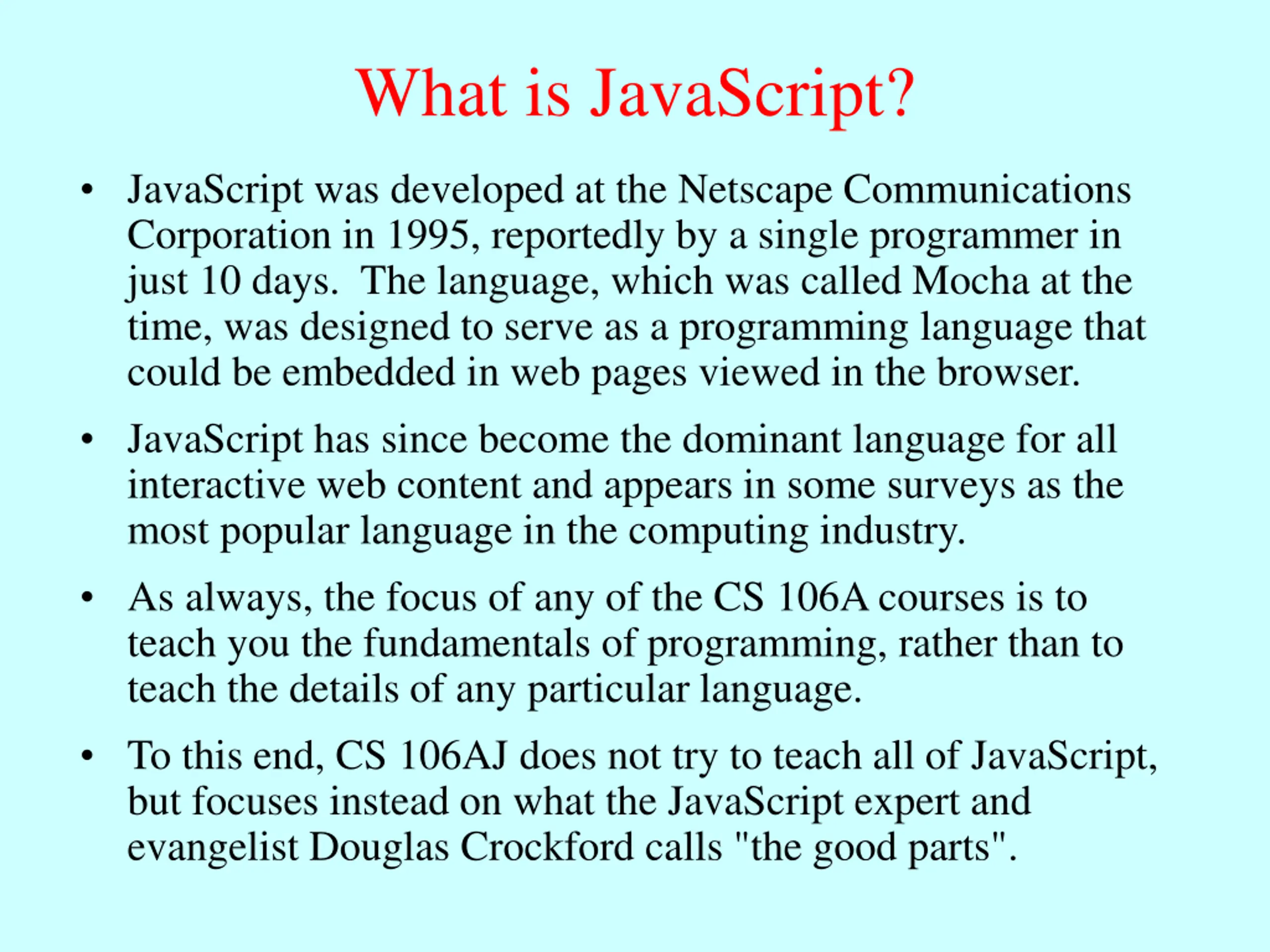 What is JavaScript? JavaScript was developed at the Netscape Communications Corporation in 1995, reportedly by a single programmer in just 10 days. The language, which was called Mocha at the time, was designed to serve as a programming language that could be embedded in web pages viewed in the browser. JavaScript has since become the dominant language for all interactive web content and appears in some surveys as the most popular language in the computing industry. As always, the focus of any of the CS 106A courses is to teach you the fundamentals of programming, rather than to teach the details of any particular language. To this end, CS 106AJ does not try to teach all of JavaScript, but focuses instead on what the JavaScript expert and evangelist Douglas Crockford calls "the good parts".