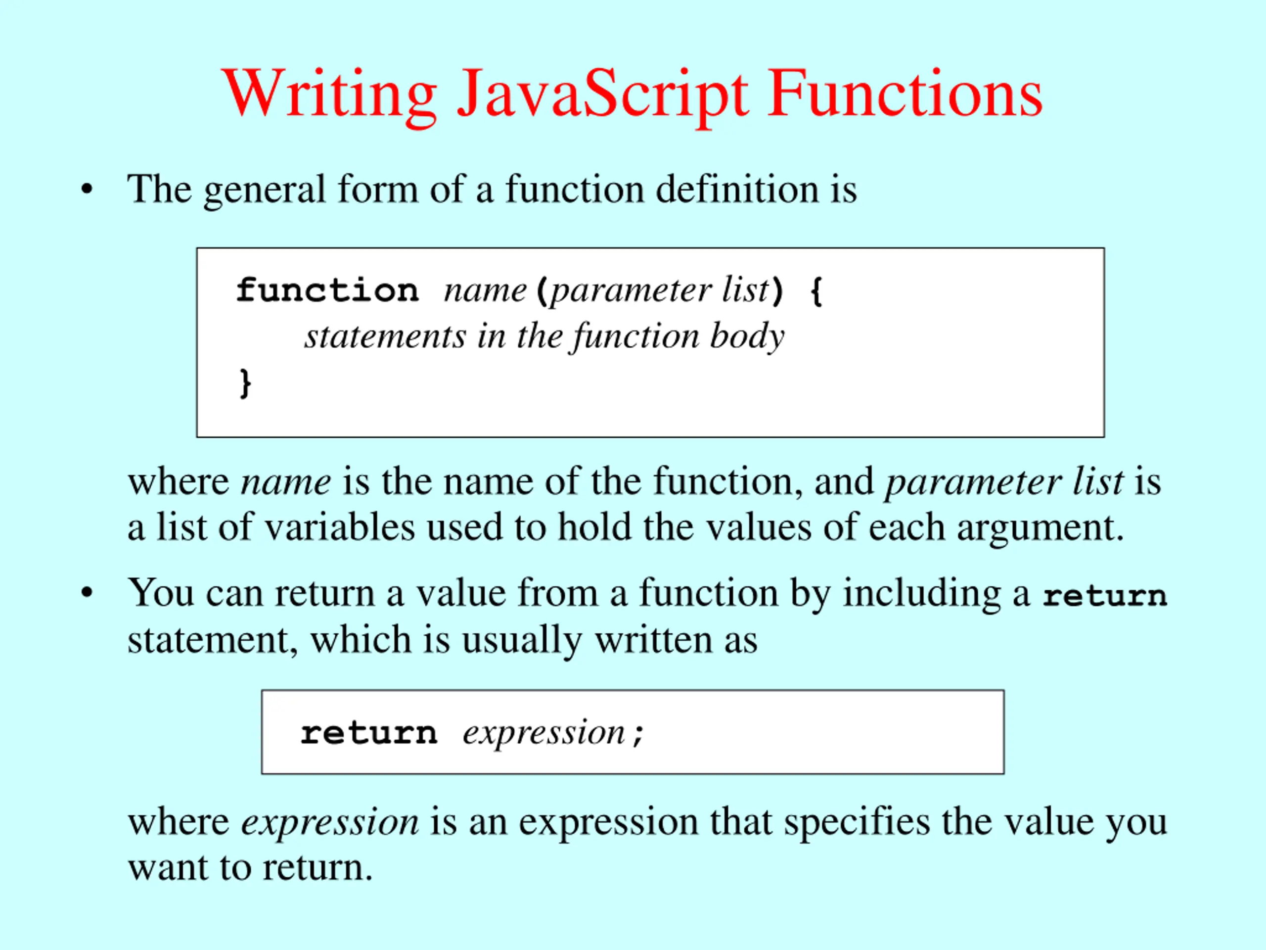 Writing JavaScript Functions The general form of a function definition is function name(parameter list){ statements in the function body } where name is the name of the function, and parameter list is a list of variables used to hold the values of each argument. You can return a value from a function by including a return statement, which is usually written as return expression; where expression is an expression that specifies the value you want to return.