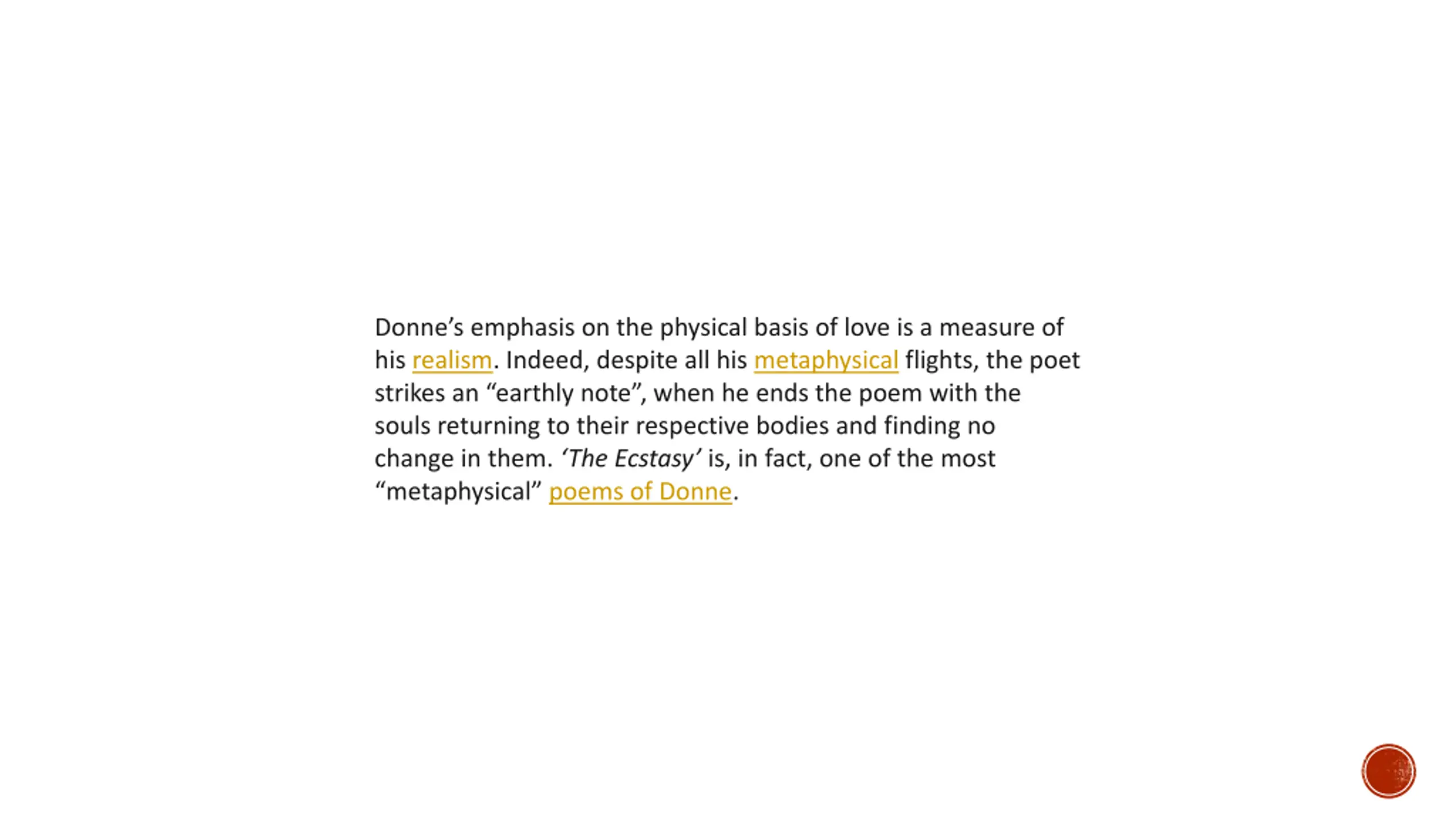 Donnes emphasis on the physical basis of love is a measure of his realism. Indeed, despite all his metaphysical flights, the poet strikes an earthly note , when he ends the poem with the souls returning to their respective bodies and finding no change in them. The Ecstasy is, in fact, one of the most metaphysical poems of Donne.