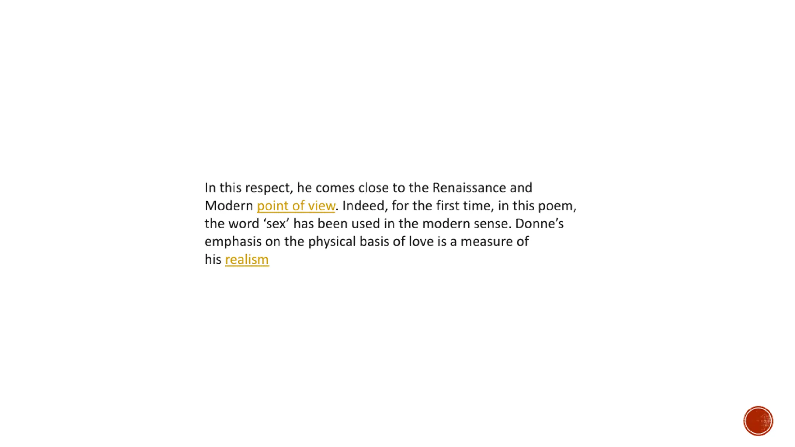 In this respect, he comes close to the Renaissance and Modern point of view. Indeed, for the first time, in this poem, the word sex has been used in the modern sense. Donne s emphasis on the physical basis of love is a measure of his realism