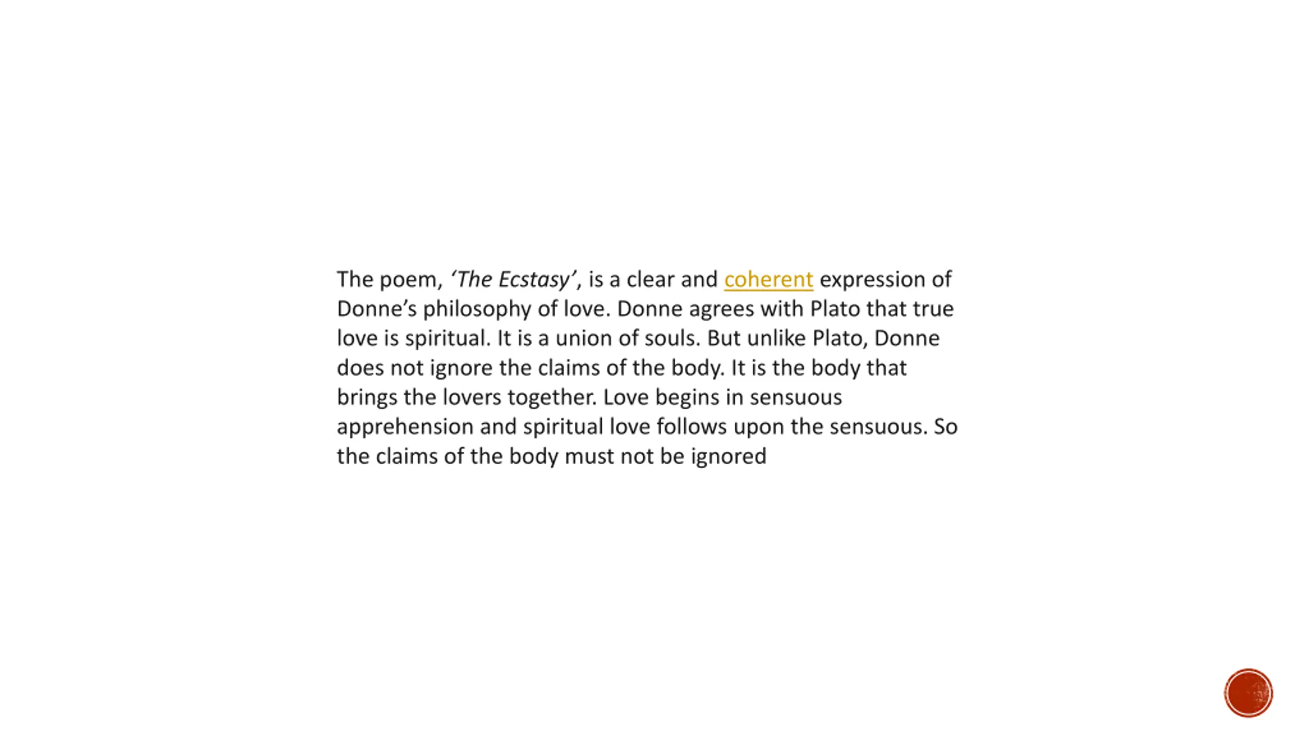 The poem, The Ecstasy, is a clear and coherent expression of Donne s philosophy of love. Donne agrees with Plato that true love is spiritual. It is a union of souls. But unlike Plato, Donne does not ignore the claims of the body. It is the body that brings the lovers together. Love begins in sensuous apprehension and spiritual love follows upon the sensuous. So the claims of the body must not be ignored