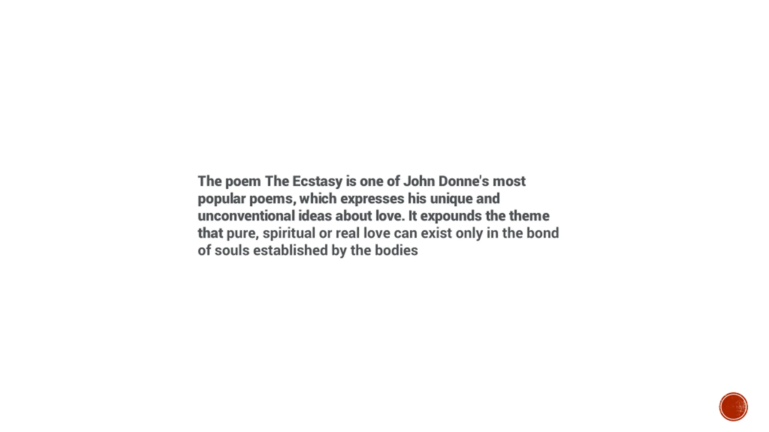 The poem The Ecstasy is one of John Donne's most popular poems, which expresses his unique and unconventional ideas about love. It expounds the theme that pure, spiritual or real love can exist only in the bond of souls established by the bodies