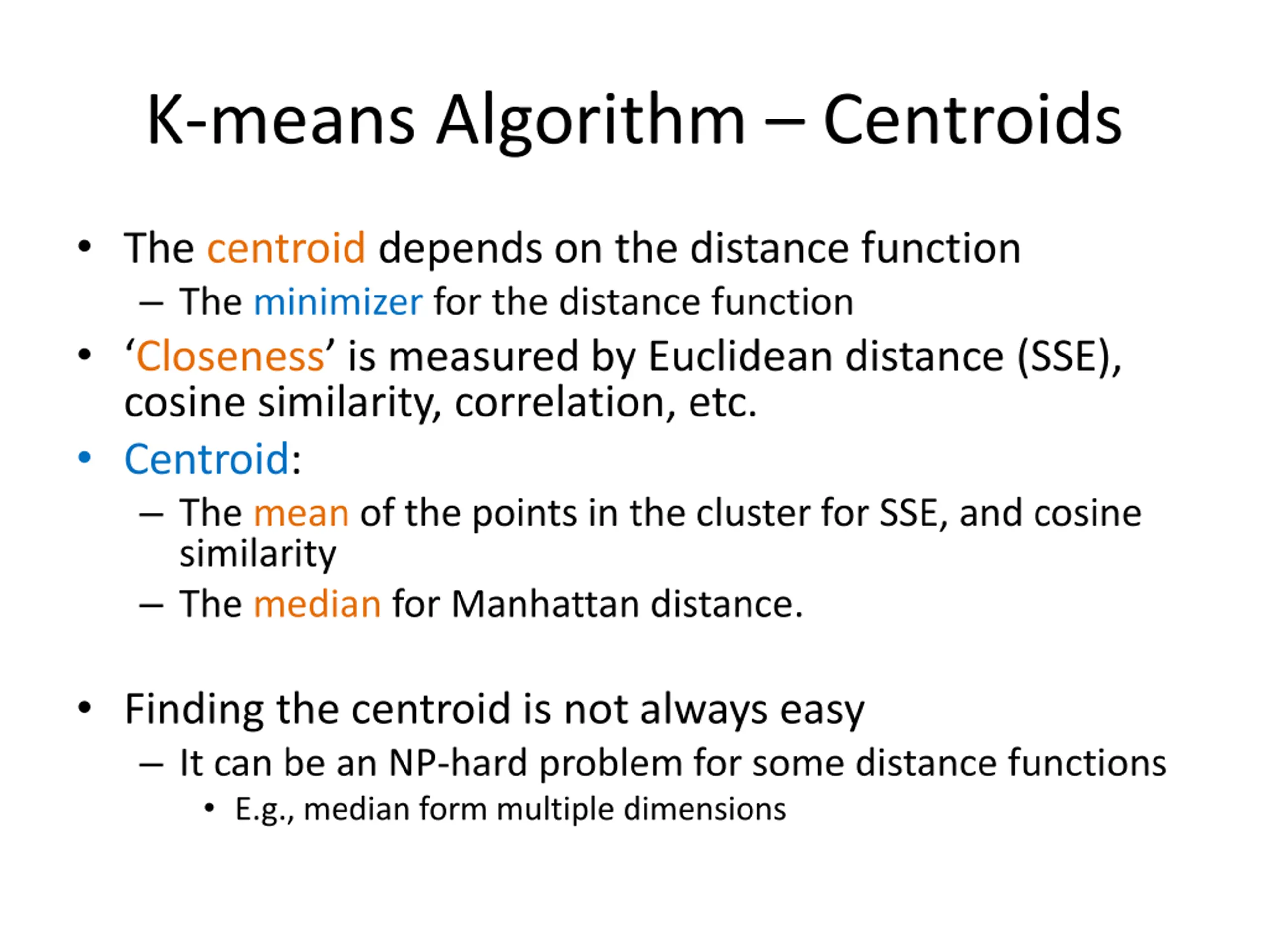 K-means Algorithm Centroids The centroid depends on the distance function The minimizer for the distance function Closeness is measured by Euclidean distance (SSE), cosine similarity, correlation, etc. Centroid: The mean of the points in the cluster for SSE, and cosine similarity The median for Manhattan distance. Finding the centroid is not always easy It can be an NP-hard problem for some distance functions E.g., median form multiple dimensions