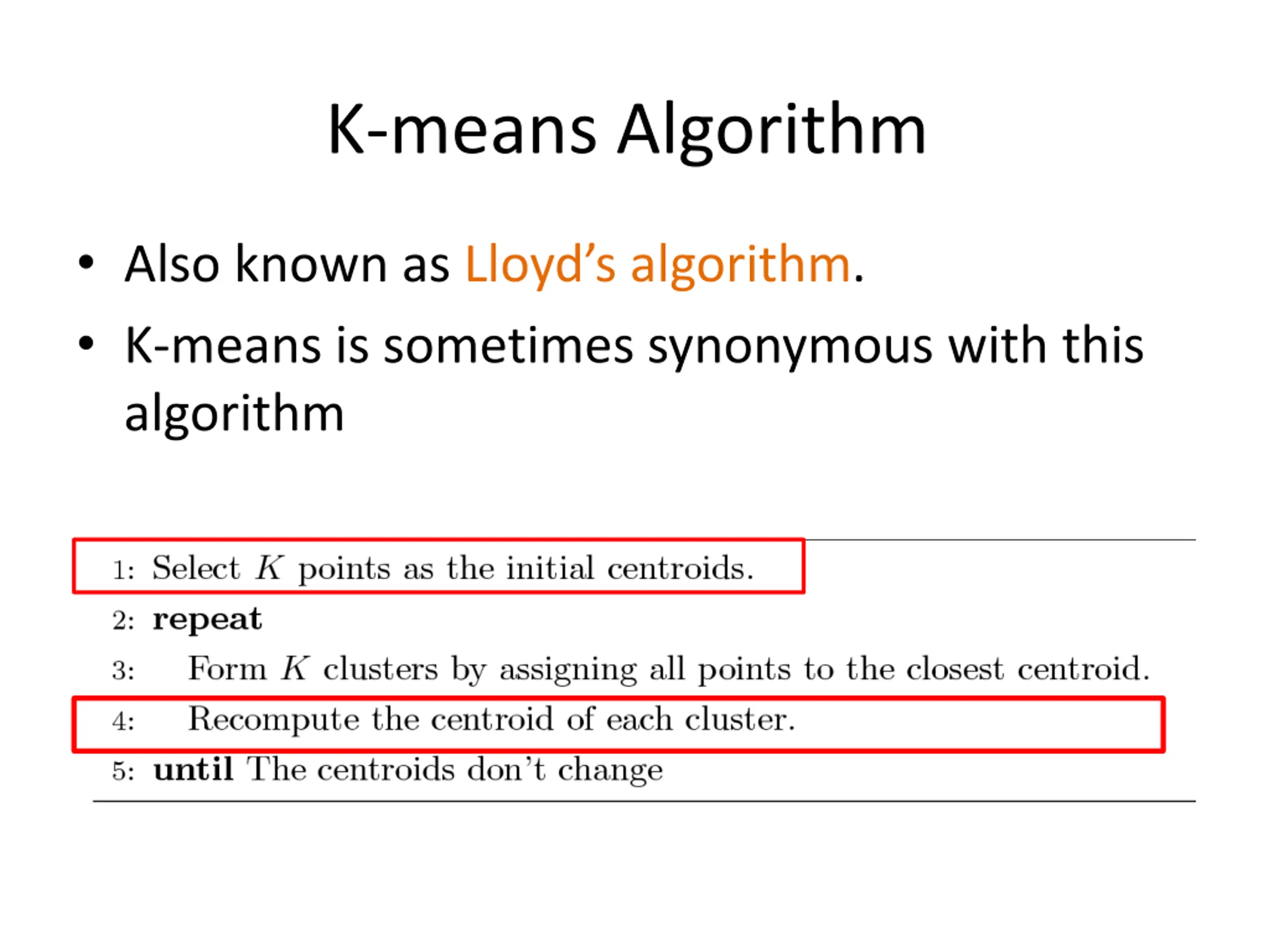 K-means Algorithm Also known as Lloyd s algorithm. K-means is sometimes synonymous with this algorithm