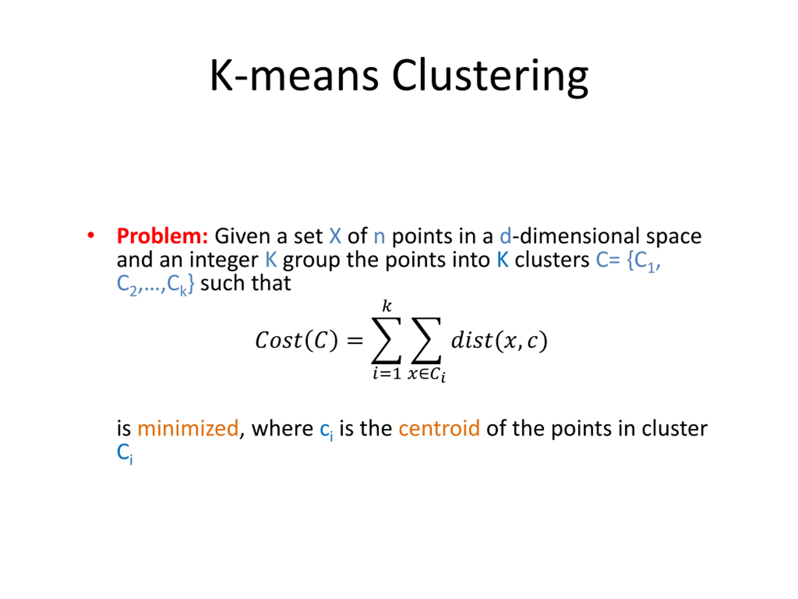 K-means Clustering Problem: Given a set X of n points in a d-dimensional space and an integer K group the points into K clusters C= {C1, C2, ,Ck} such that ? ???? ? = ????(?,?) ?=1 ? ?? is minimized, where ciis the centroid of the points in cluster Ci