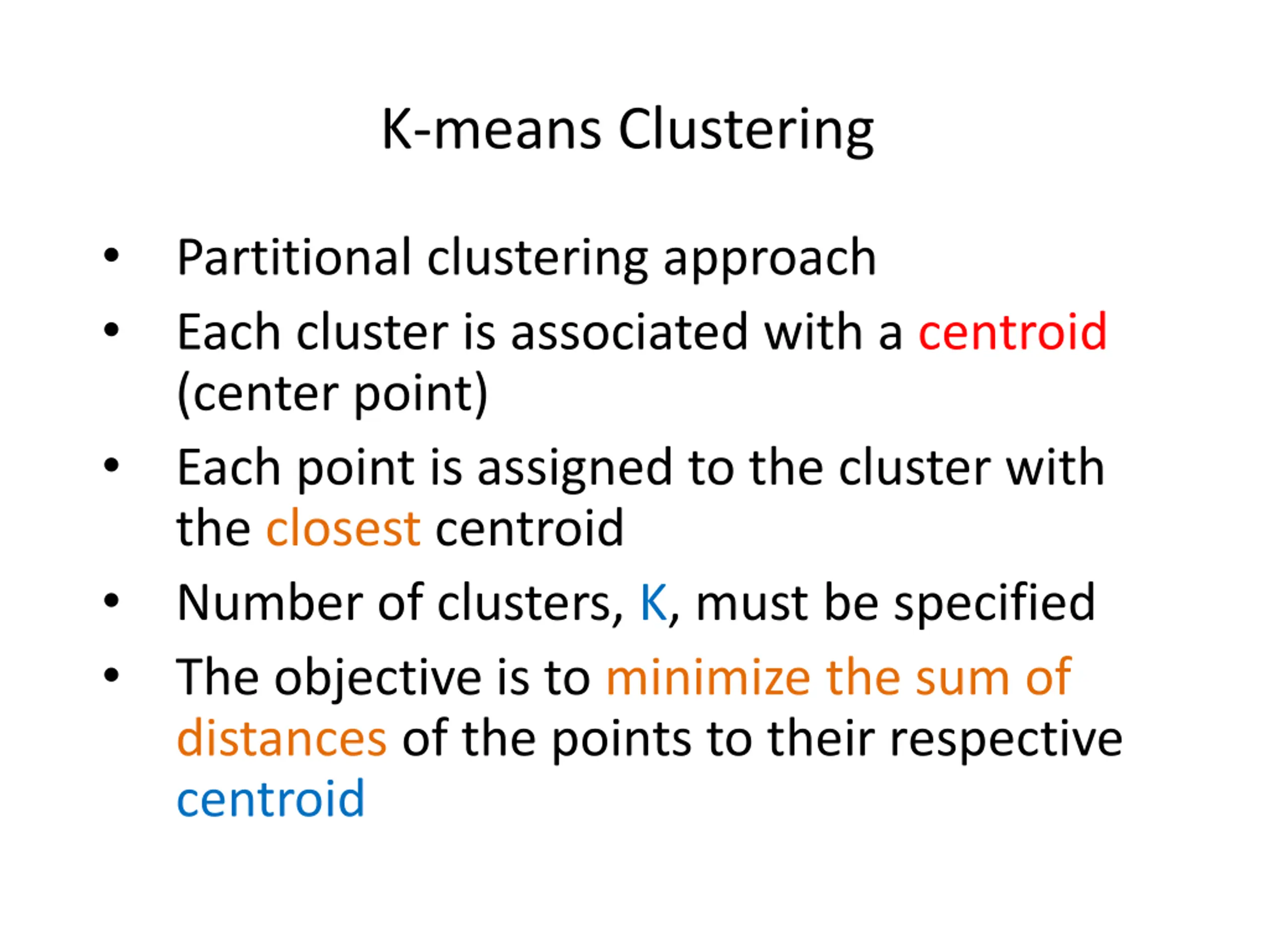 K-means Clustering Partitional clustering approach Each cluster is associated with a centroid (center point) Each point is assigned to the cluster with the closest centroid Number of clusters, K, must be specified The objective is to minimize the sum of distances of the points to their respective centroid