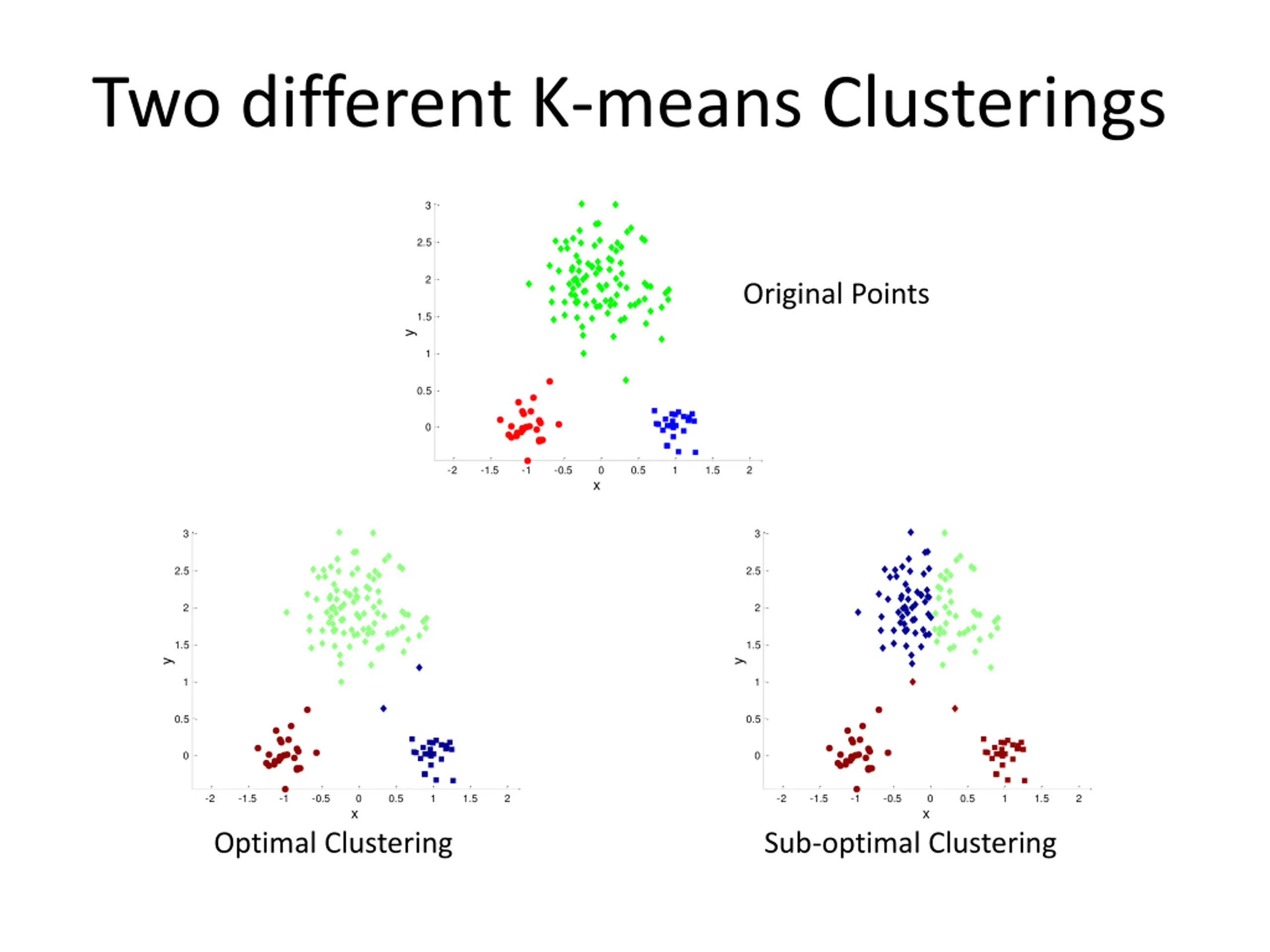 Two different K-means Clusterings 3 2.5 2 Original Points 1.5 y 1 0.5 0 -2 -1.5 -1 -0.5 0 0.5 1 1.5 2 x 3 3 2.5 2.5 2 2 1.5 1.5 y y 1 1 0.5 0.5 0 0 -2 -1.5 -1 -0.5 0 0.5 1 1.5 2 -2 -1.5 -1 -0.5 0 0.5 1 1.5 2 x x Optimal Clustering Sub-optimal Clustering