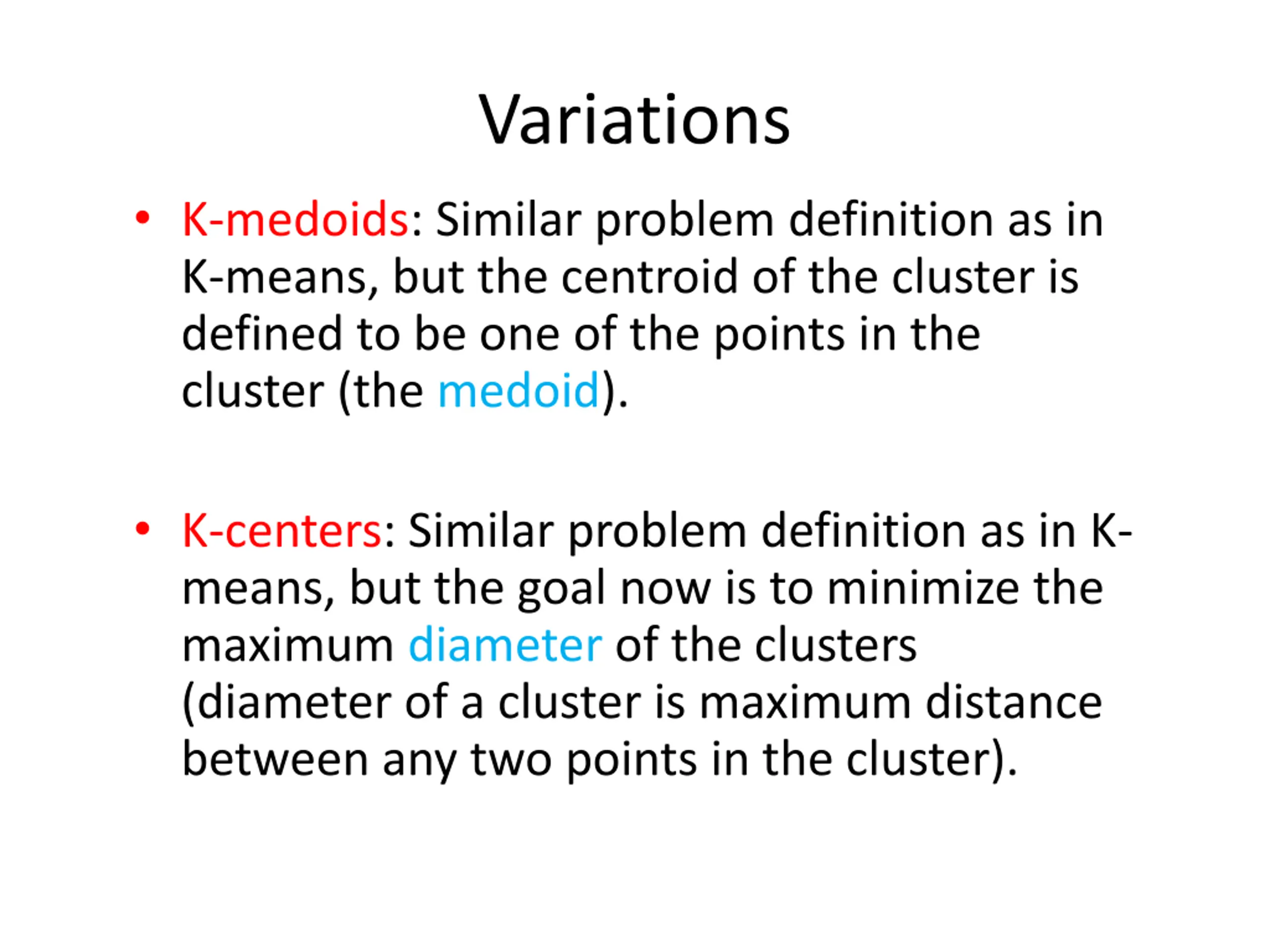 Variations K-medoids: Similar problem definition as in K-means, but the centroid of the cluster is defined to be one of the points in the cluster (the medoid). K-centers: Similar problem definition as in K- means, but the goal now is to minimize the maximum diameter of the clusters (diameter of a cluster is maximum distance between any two points in the cluster).