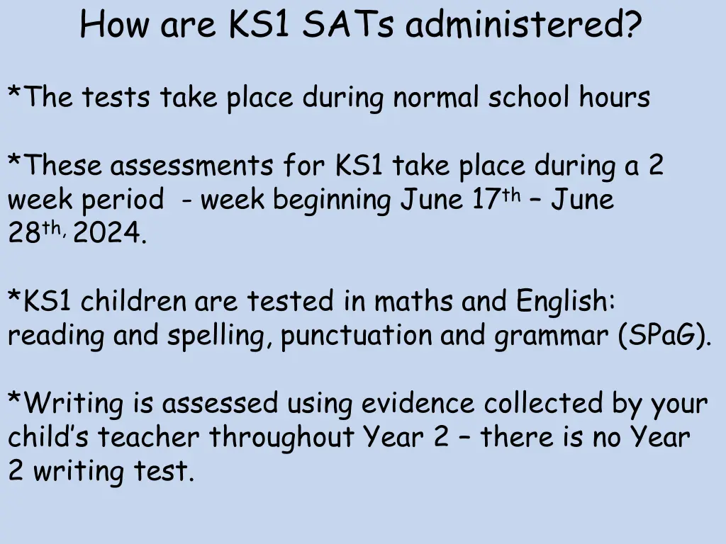 How are KS1 SATs administered? *The tests take place during normal school hours *These assessments for KS1 take place during a 2 week period - week beginning June 17th June 28th, 2024. *KS1 children are tested in maths and English: reading and spelling, punctuation and grammar (SPaG). *Writing is assessed using evidence collected by your child s teacher throughout Year 2 there is no Year 2 writing test.
