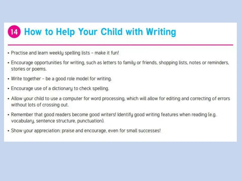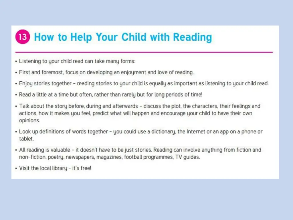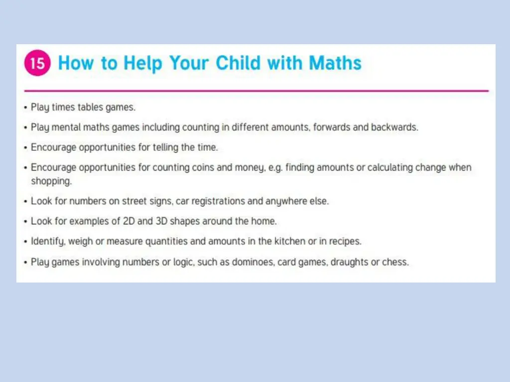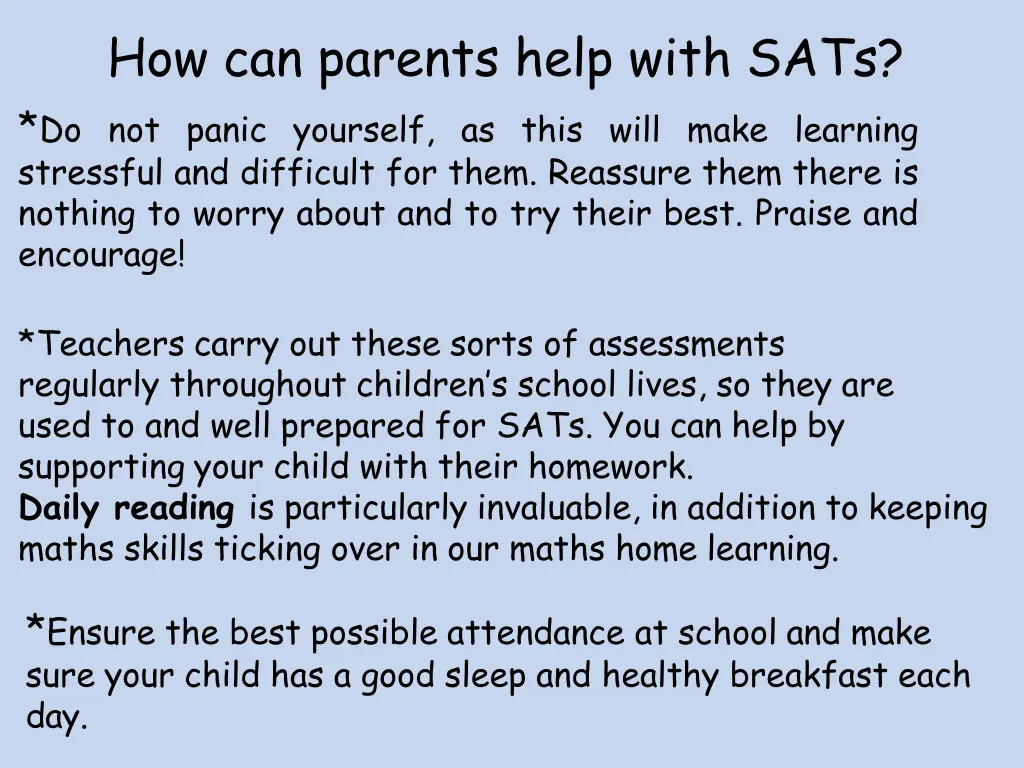 How can parents help with SATs? *Do not panic yourself, as this will make learning stressful and difficult for them. Reassure them there is nothing to worry about and to try their best. Praise and encourage! *Teachers carry out these sorts of assessments regularly throughout children s school lives, so they are used to and well prepared for SATs. You can help by supporting your child with their homework. Daily reading is particularly invaluable, in addition to keeping maths skills ticking over in our maths home learning. *Ensure the best possible attendance at school and make sure your child has a good sleep and healthy breakfast each day.