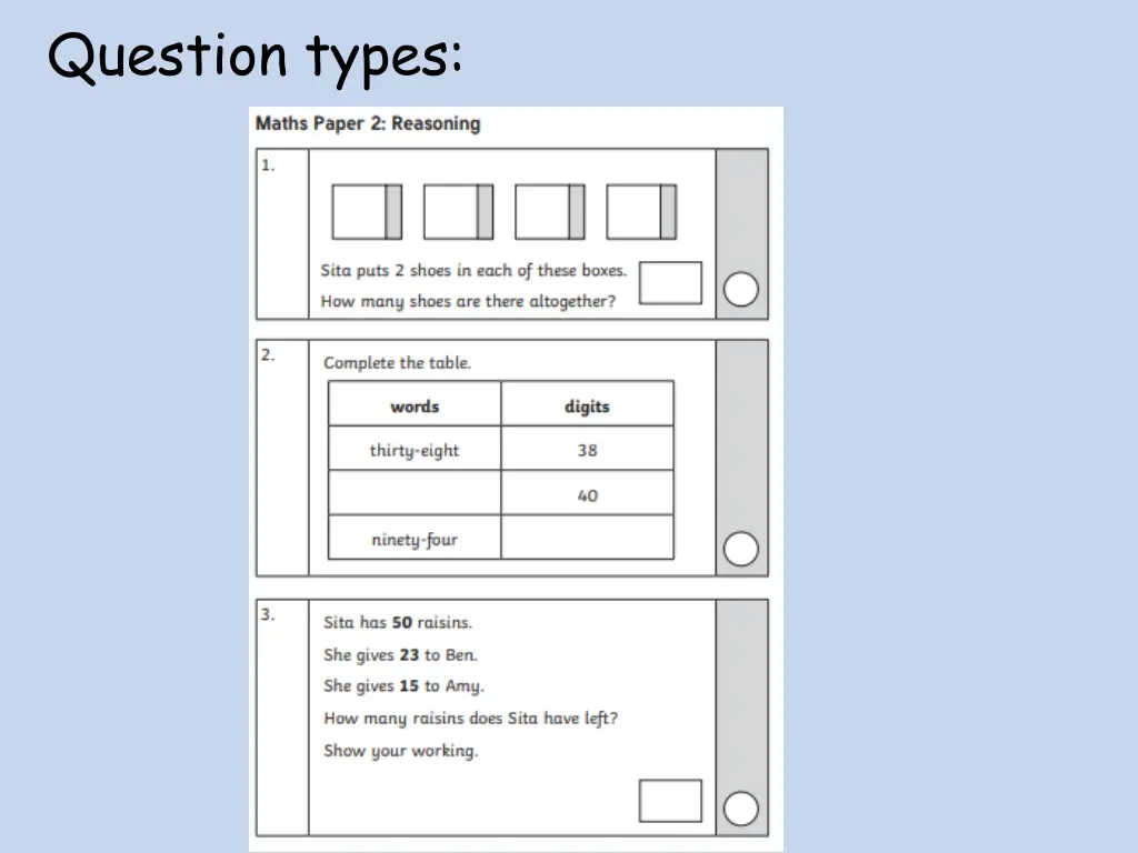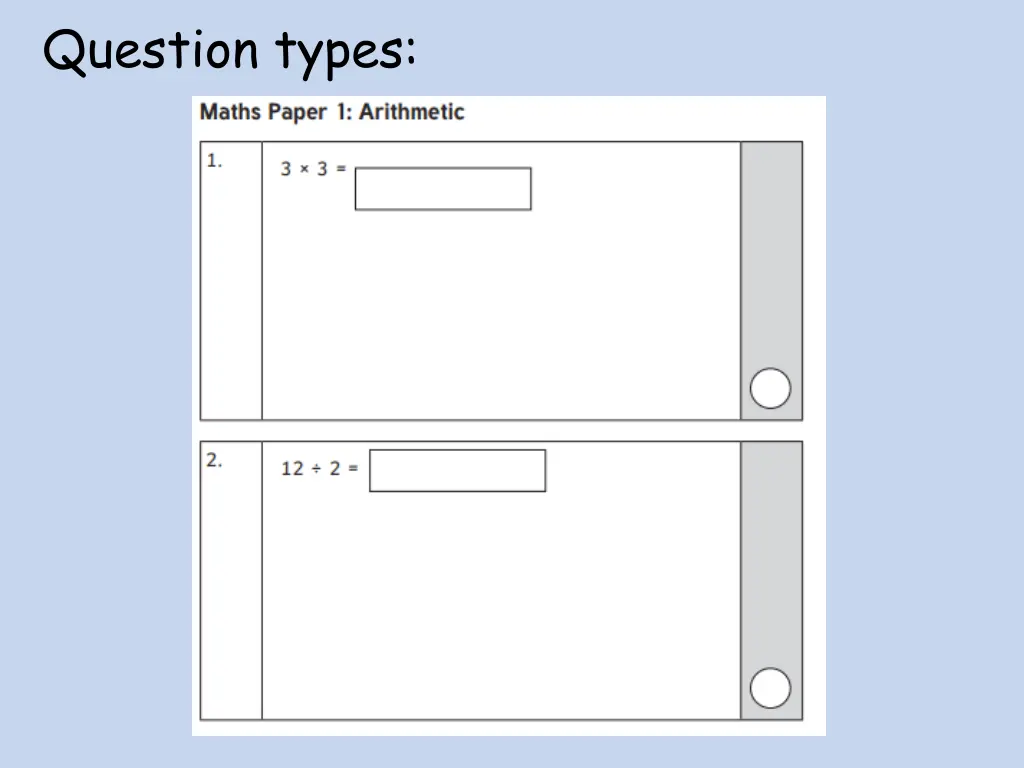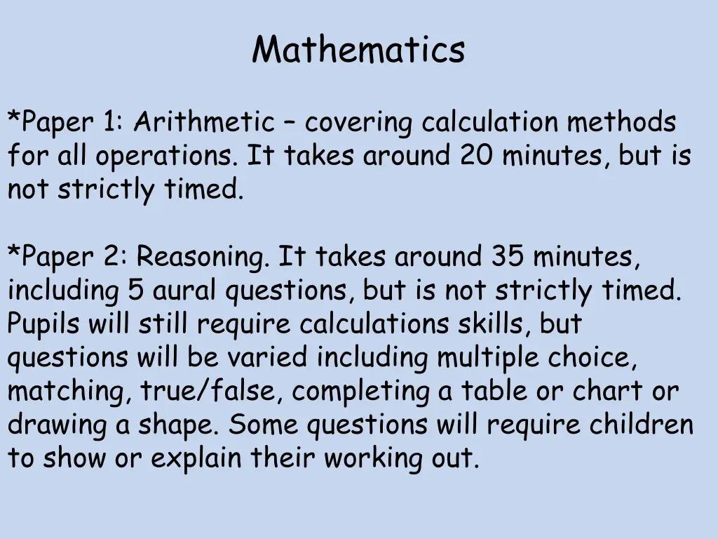 Mathematics *Paper 1: Arithmetic covering calculation methods for all operations. It takes around 20 minutes, but is not strictly timed. *Paper 2: Reasoning. It takes around 35 minutes, including 5 aural questions, but is not strictly timed. Pupils will still require calculations skills, but questions will be varied including multiple choice, matching, true/false, completing a table or chart or drawing a shape. Some questions will require children to show or explain their working out.