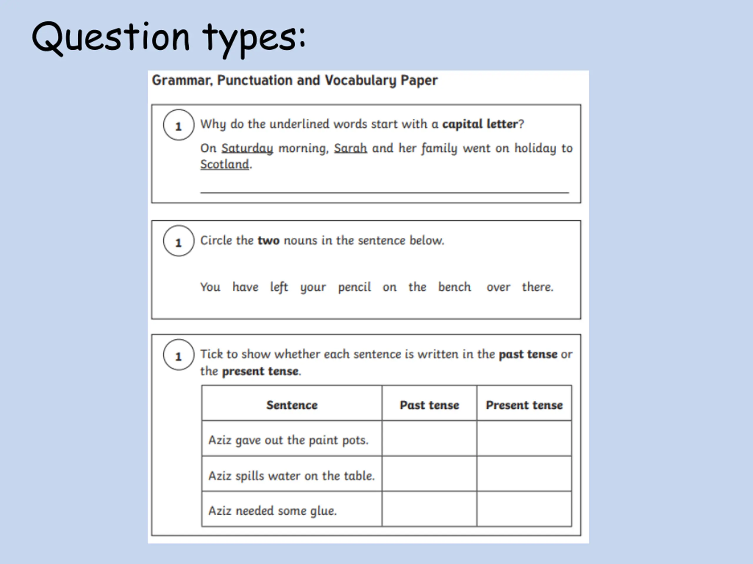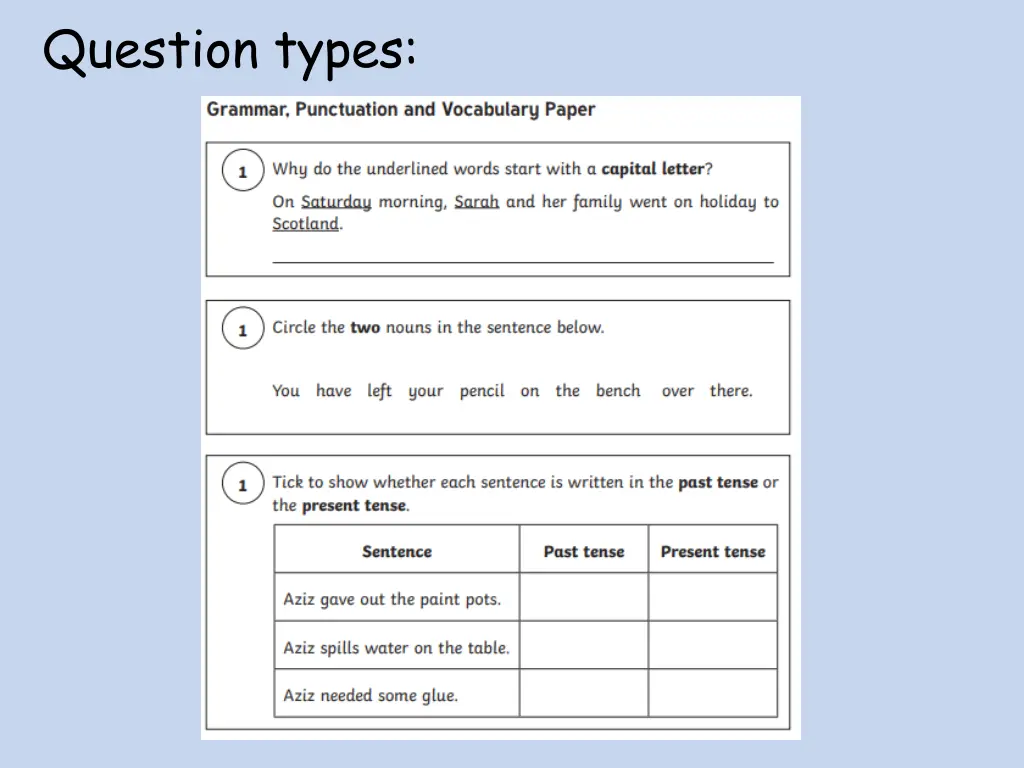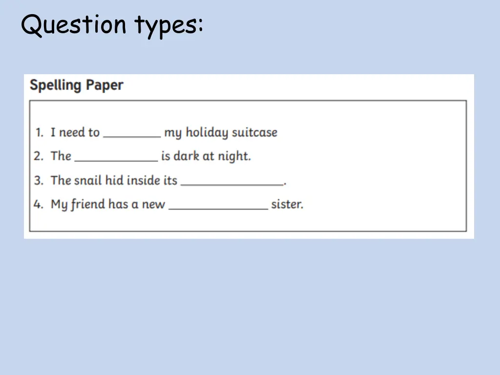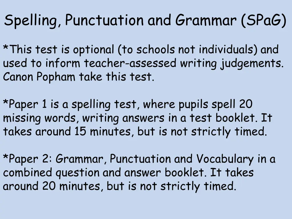 Spelling, Punctuation and Grammar (SPaG) *This test is optional (to schools not individuals) and used to inform teacher-assessed writing judgements. Canon Popham take this test. *Paper 1 is a spelling test, where pupils spell 20 missing words, writing answers in a test booklet. It takes around 15 minutes, but is not strictly timed. *Paper 2: Grammar, Punctuation and Vocabulary in a combined question and answer booklet. It takes around 20 minutes, but is not strictly timed.