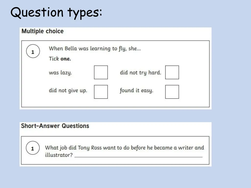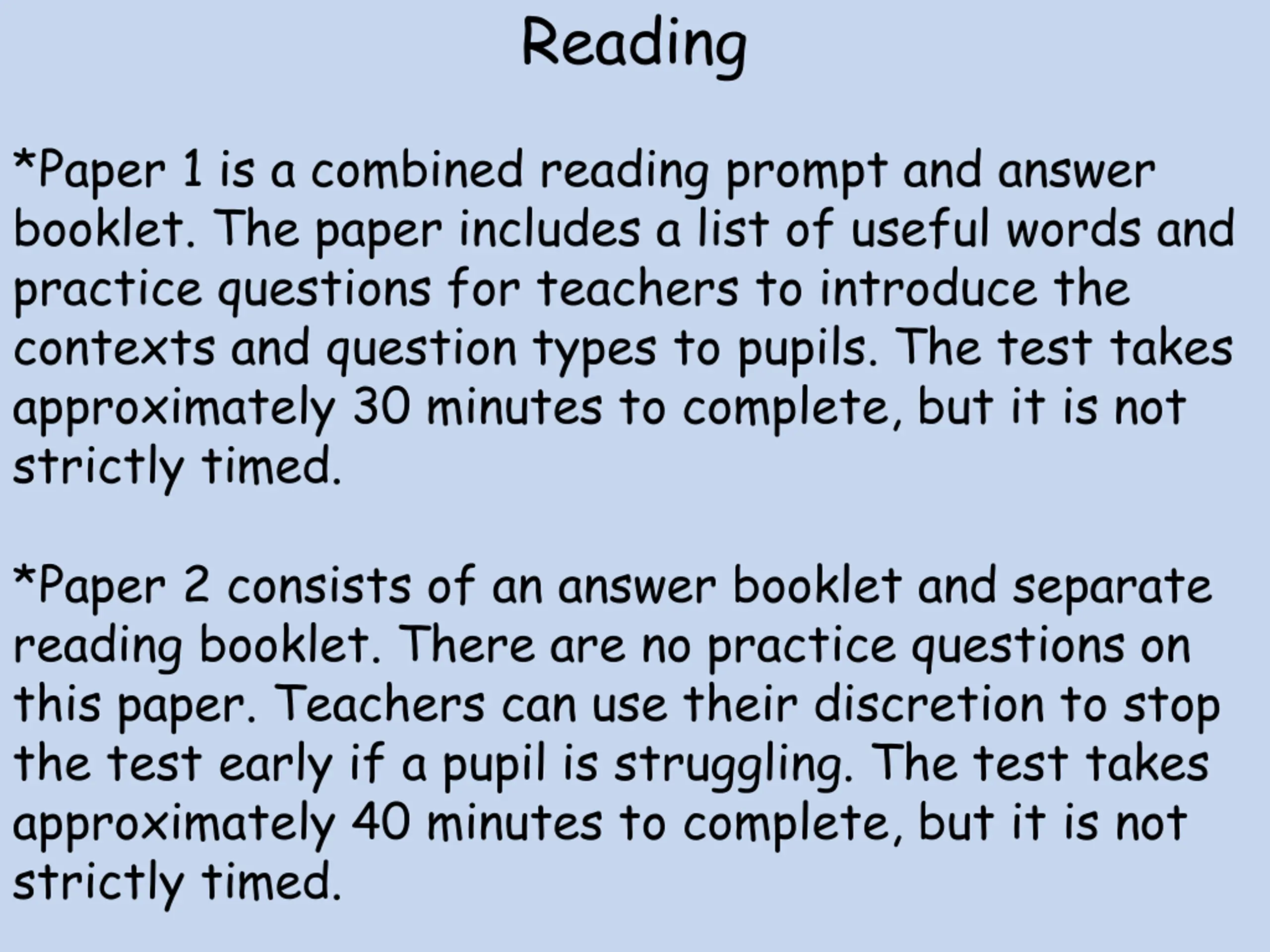 Reading *Paper 1 is a combined reading prompt and answer booklet. The paper includes a list of useful words and practice questions for teachers to introduce the contexts and question types to pupils. The test takes approximately 30 minutes to complete, but it is not strictly timed. *Paper 2 consists of an answer booklet and separate reading booklet. There are no practice questions on this paper. Teachers can use their discretion to stop the test early if a pupil is struggling. The test takes approximately 40 minutes to complete, but it is not strictly timed.