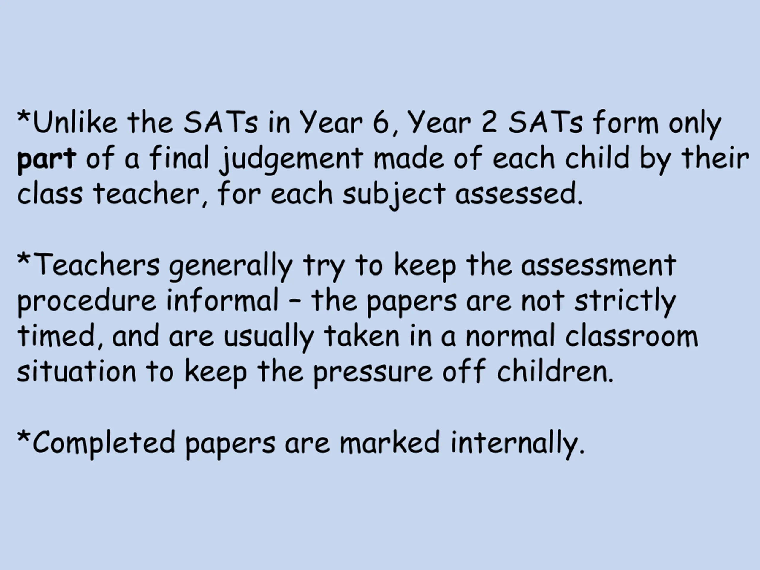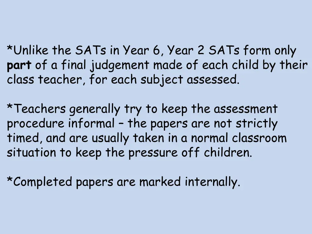 *Unlike the SATs in Year 6, Year 2 SATs form only part of a final judgement made of each child by their class teacher, for each subject assessed. *Teachers generally try to keep the assessment procedure informal the papers are not strictly timed, and are usually taken in a normal classroom situation to keep the pressure off children. *Completed papers are marked internally.