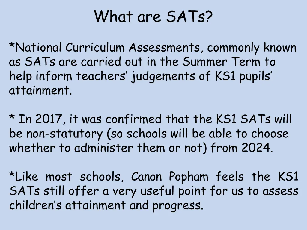 What are SATs? *National Curriculum Assessments, commonly known as SATs are carried out in the Summer Term to help inform teachers judgements of KS1 pupils attainment. * In 2017, it was confirmed that the KS1 SATs will be non-statutory (so schools will be able to choose whether to administer them or not) from 2024. *Like most schools, Canon Popham feels the KS1 SATs still offer a very useful point for us to assess children s attainment and progress.