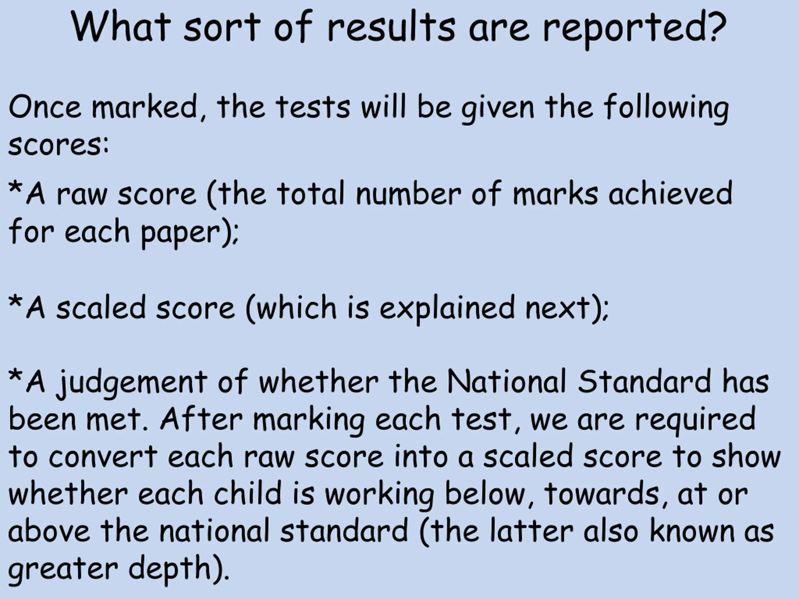 What sort of results are reported? Once marked, the tests will be given the following scores: *A raw score (the total number of marks achieved for each paper); *A scaled score (which is explained next); *A judgement of whether the National Standard has been met. After marking each test, we are required to convert each raw score into a scaled score to show whether each child is working below, towards, at or above the national standard (the latter also known as greater depth).