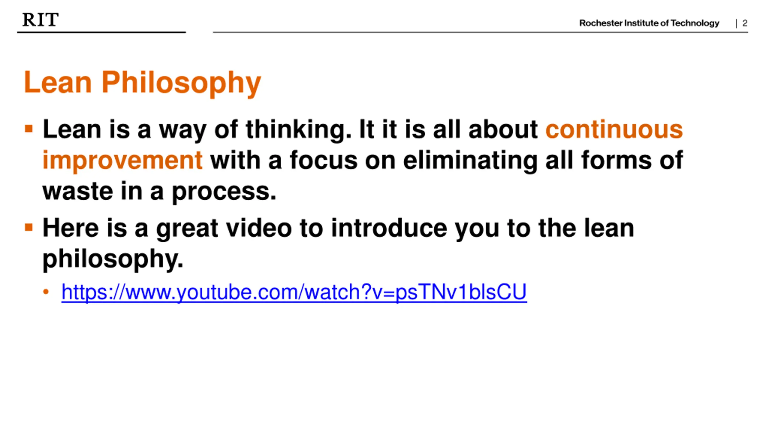 | 2 Lean Philosophy Lean is a way of thinking. It it is all about continuous improvement with a focus on eliminating all forms of waste in a process. Here is a great video to introduce you to the lean philosophy. https://www.youtube.com/watch?v=psTNv1blsCU