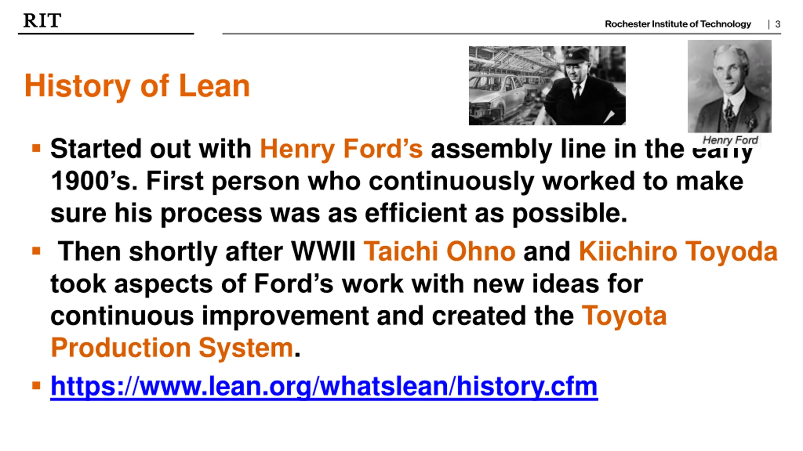 | 3 History of Lean Started out with Henry Ford s assembly line in the early 1900 s. First person who continuously worked to make sure his process was as efficient as possible. Then shortly after WWII Taichi Ohno and Kiichiro Toyoda took aspects of Ford s work with new ideas for continuous improvement and created the Toyota Production System. https://www.lean.org/whatslean/history.cfm