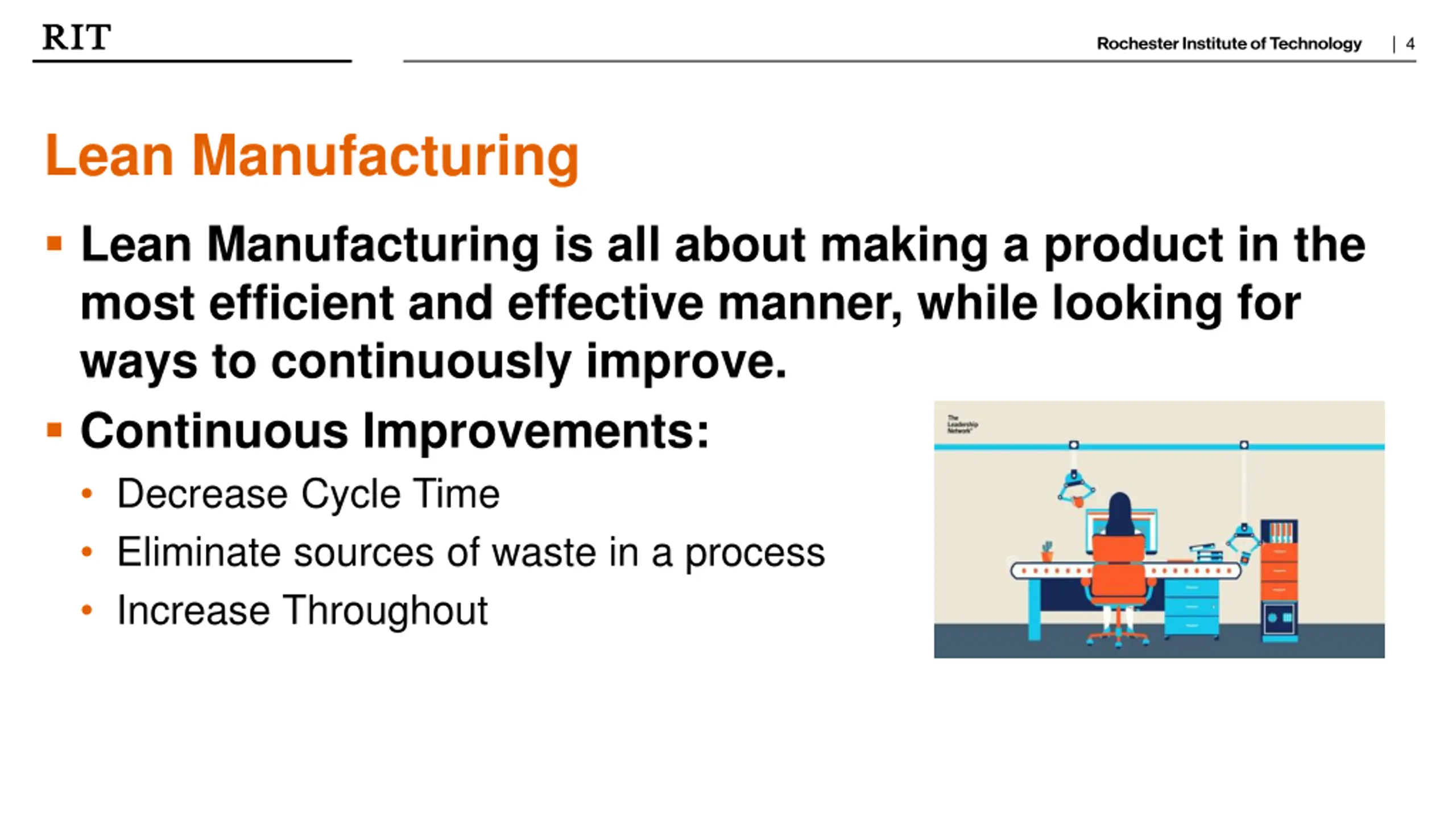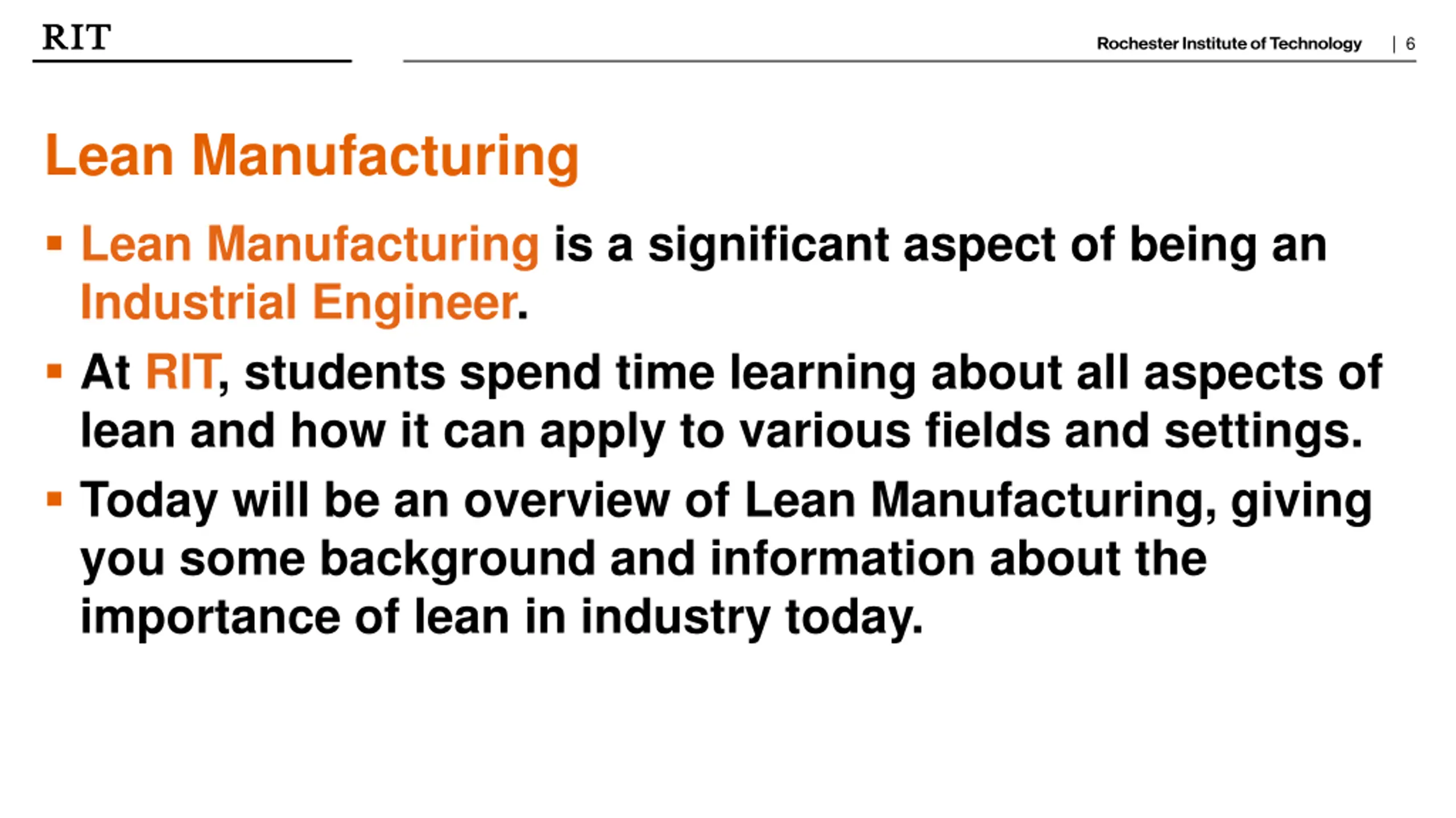 | 6 Lean Manufacturing Lean Manufacturing is a significant aspect of being an Industrial Engineer. At RIT, students spend time learning about all aspects of lean and how it can apply to various fields and settings. Today will be an overview of Lean Manufacturing, giving you some background and information about the importance of lean in industry today.
