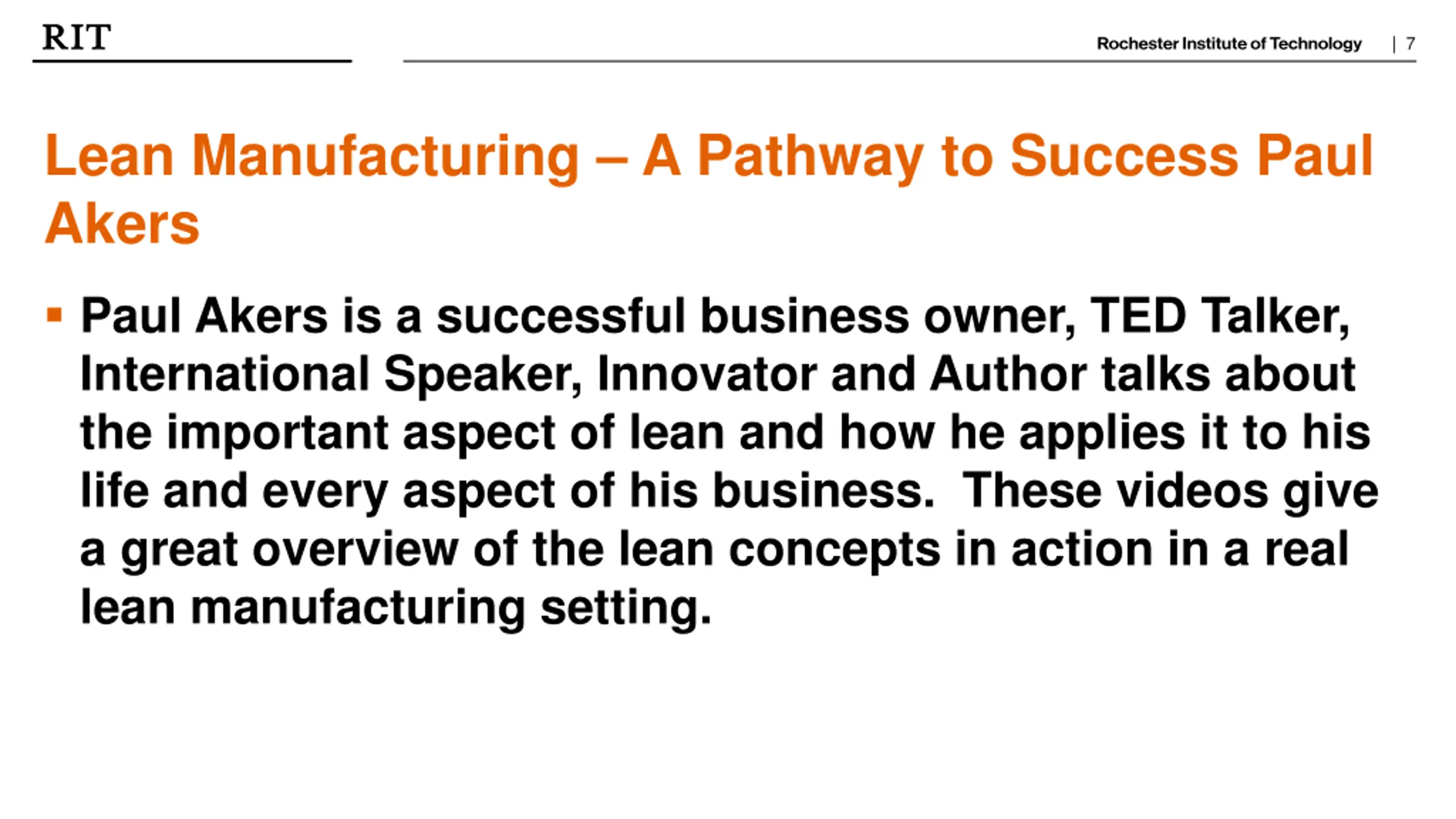 | 7 Lean Manufacturing A Pathway to Success Paul Akers Paul Akers is a successful business owner, TED Talker, International Speaker, Innovator and Author talks about the important aspect of lean and how he applies it to his life and every aspect of his business. These videos give a great overview of the lean concepts in action in a real lean manufacturing setting.