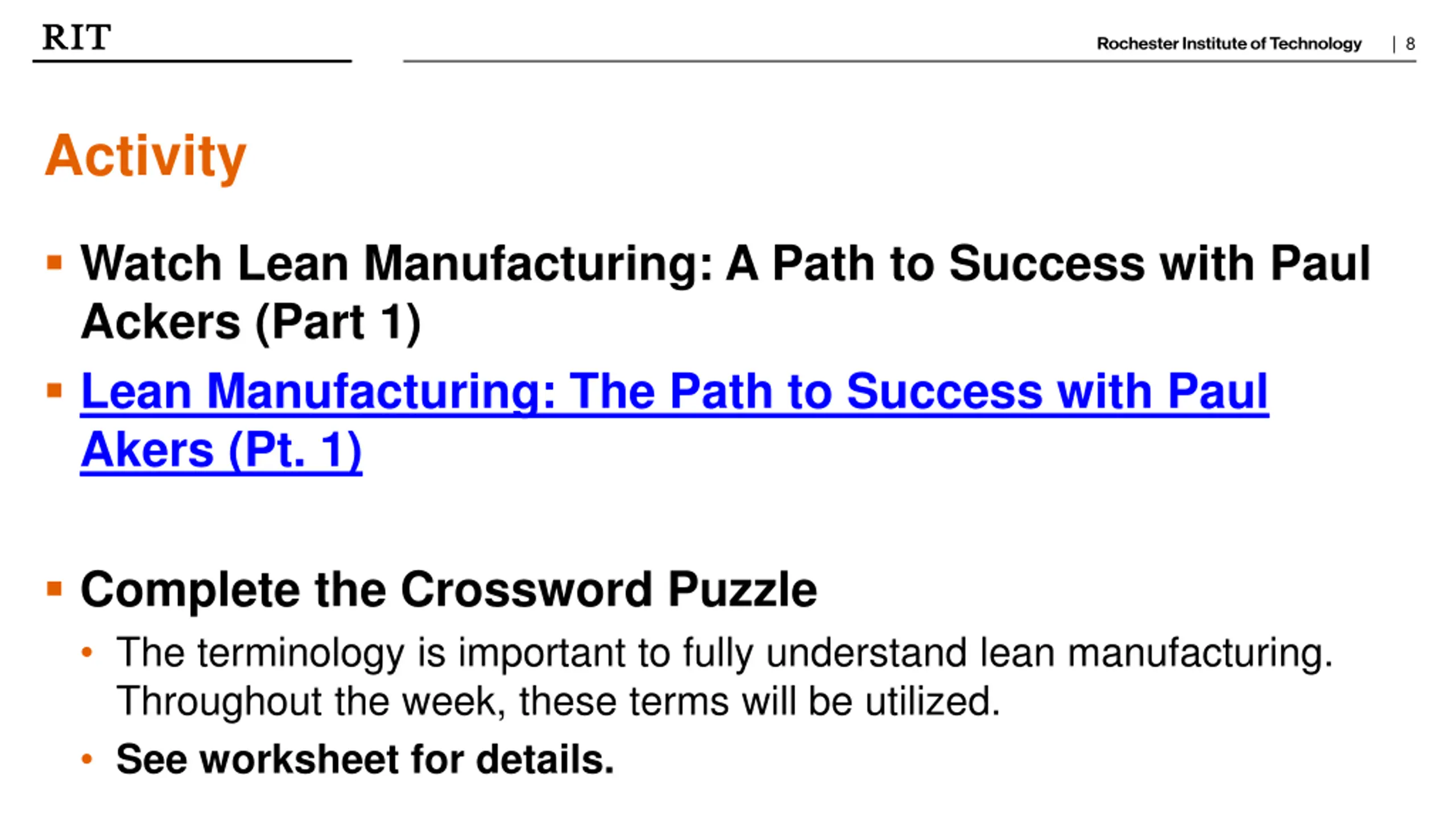 | 8 Activity Watch Lean Manufacturing: A Path to Success with Paul Ackers (Part 1) Lean Manufacturing: The Path to Success with Paul Akers (Pt. 1) Complete the Crossword Puzzle The terminology is important to fully understand lean manufacturing. Throughout the week, these terms will be utilized. See worksheet for details.