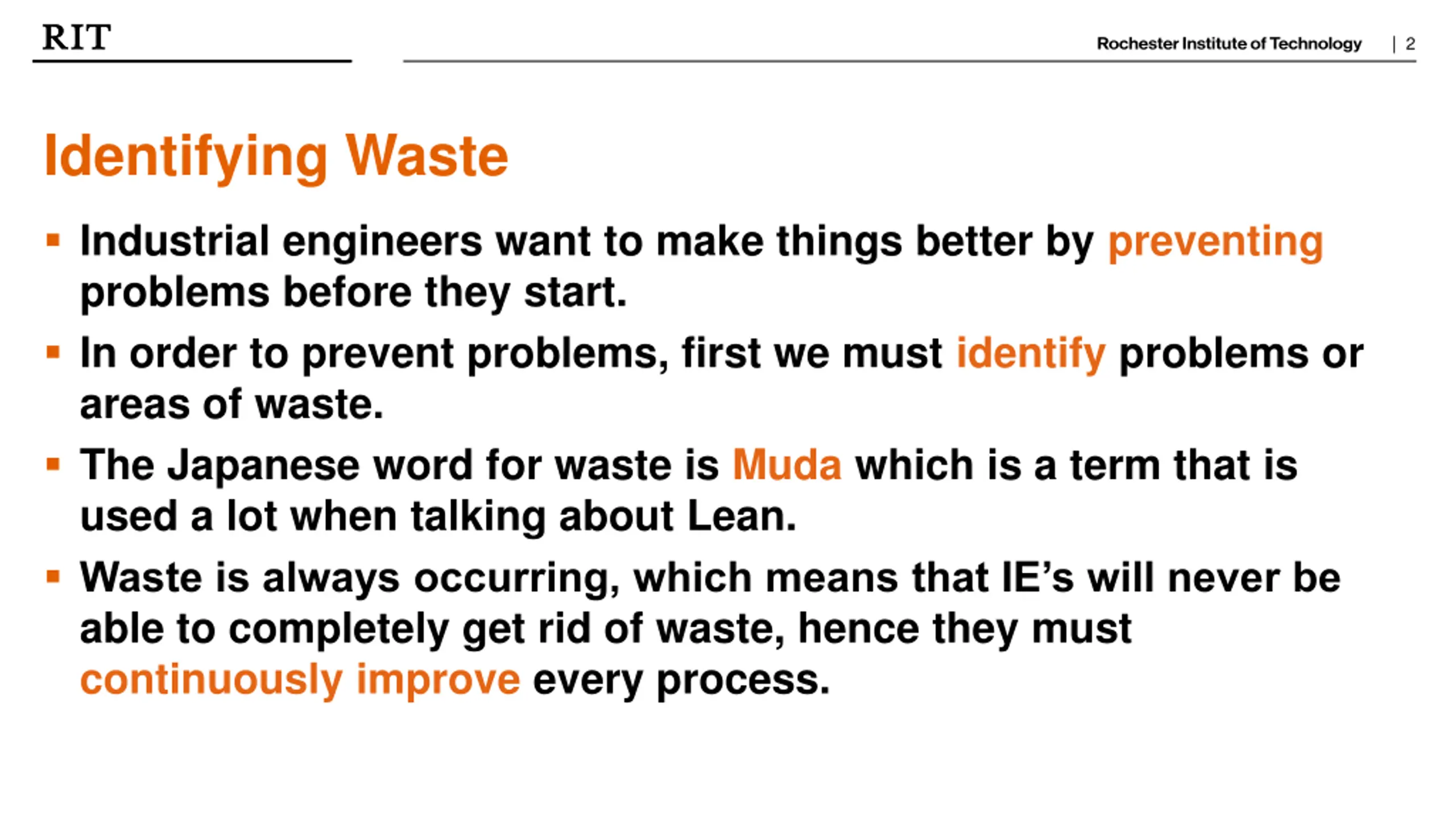 | 2 Identifying Waste Industrial engineers want to make things better by preventing problems before they start. In order to prevent problems, first we must identify problems or areas of waste. The Japanese word for waste is Muda which is a term that is used a lot when talking about Lean. Waste is always occurring, which means that IE s will never be able to completely get rid of waste, hence they must continuously improve every process.