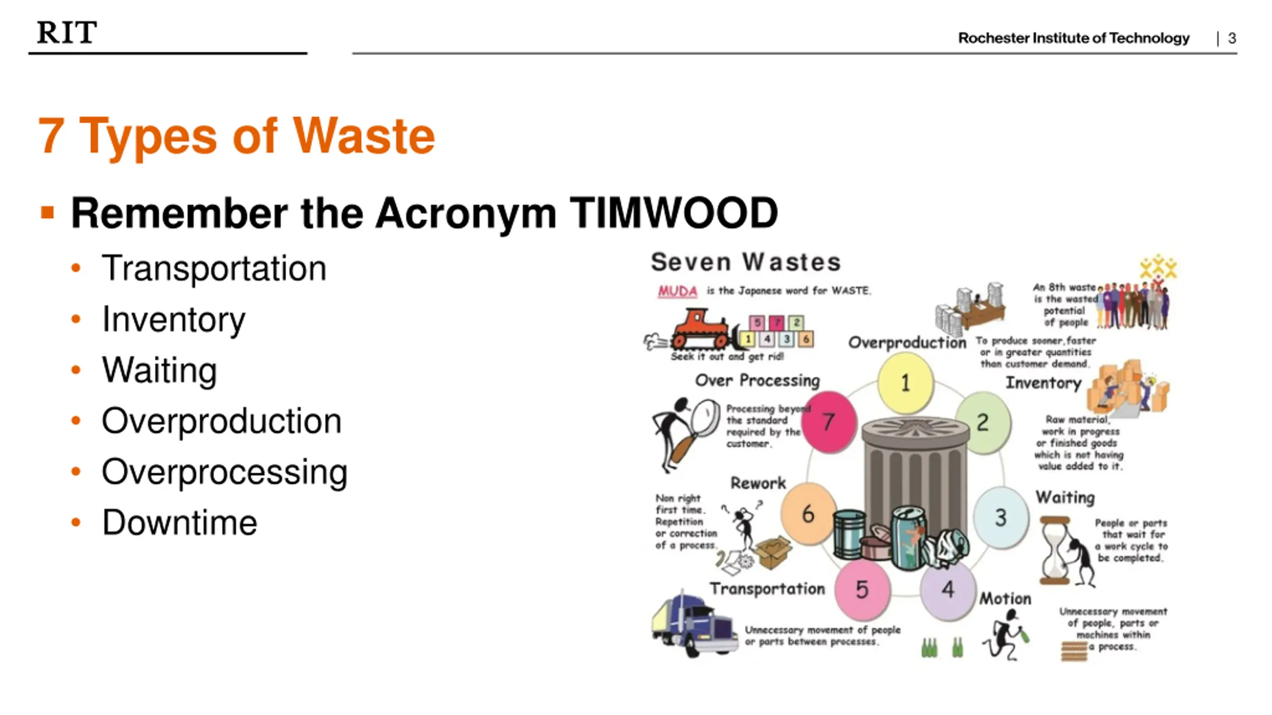 | 3 7 Types of Waste Remember the Acronym TIMWOOD Transportation Inventory Waiting Overproduction Overprocessing Downtime