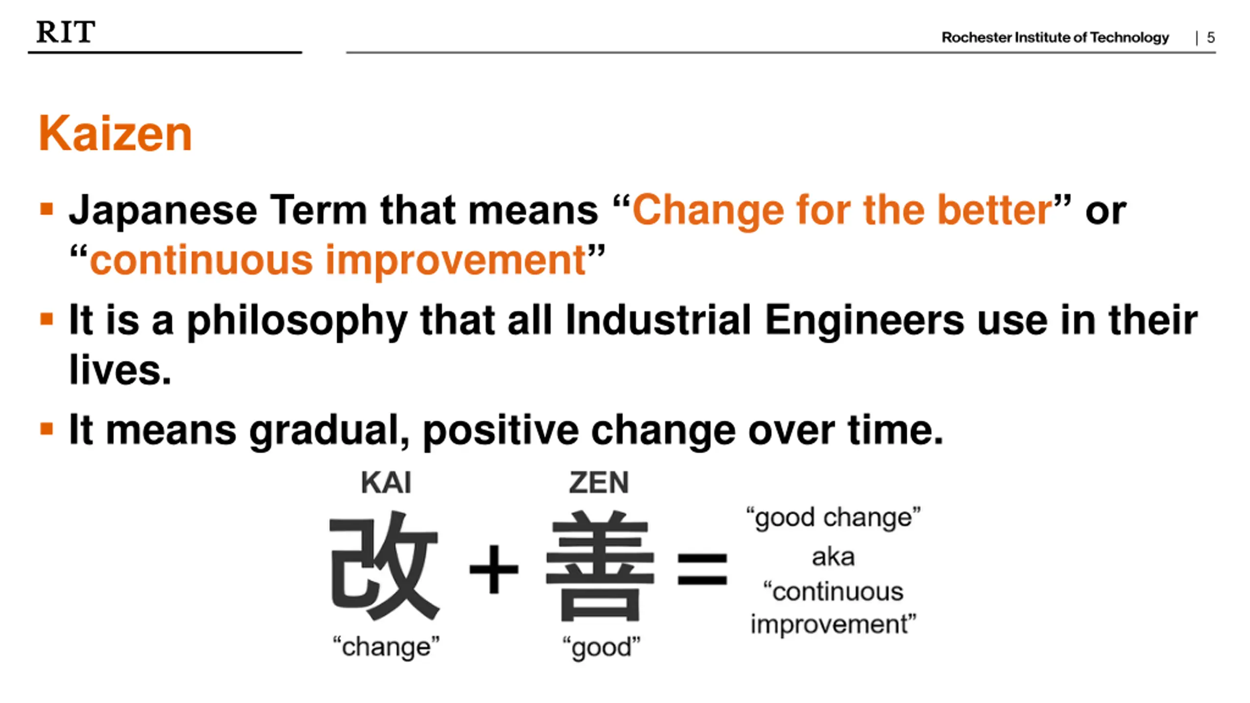| 5 Kaizen Japanese Term that means Change for the better or continuous improvement It is a philosophy that all Industrial Engineers use in their lives. It means gradual, positive change over time.