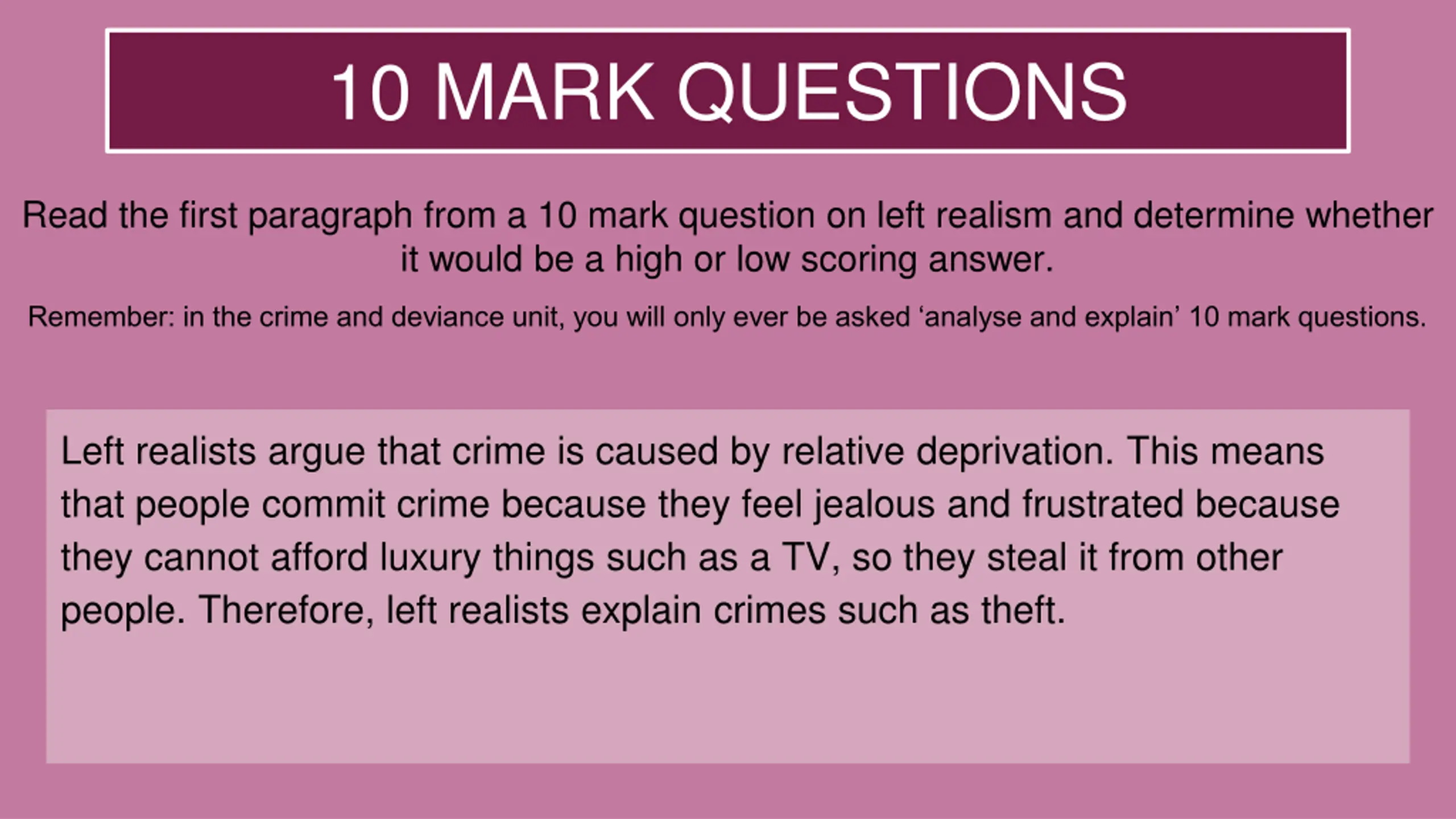 10 MARK QUESTIONS Read the first paragraph from a 10 mark question on left realism and determine whether it would be a high or low scoring answer. Remember: in the crime and deviance unit, you will only ever be asked analyse and explain 10 mark questions. Left realists argue that crime is caused by relative deprivation. This means that people commit crime because they feel jealous and frustrated because they cannot afford luxury things such as a TV, so they steal it from other people. Therefore, left realists explain crimes such as theft.