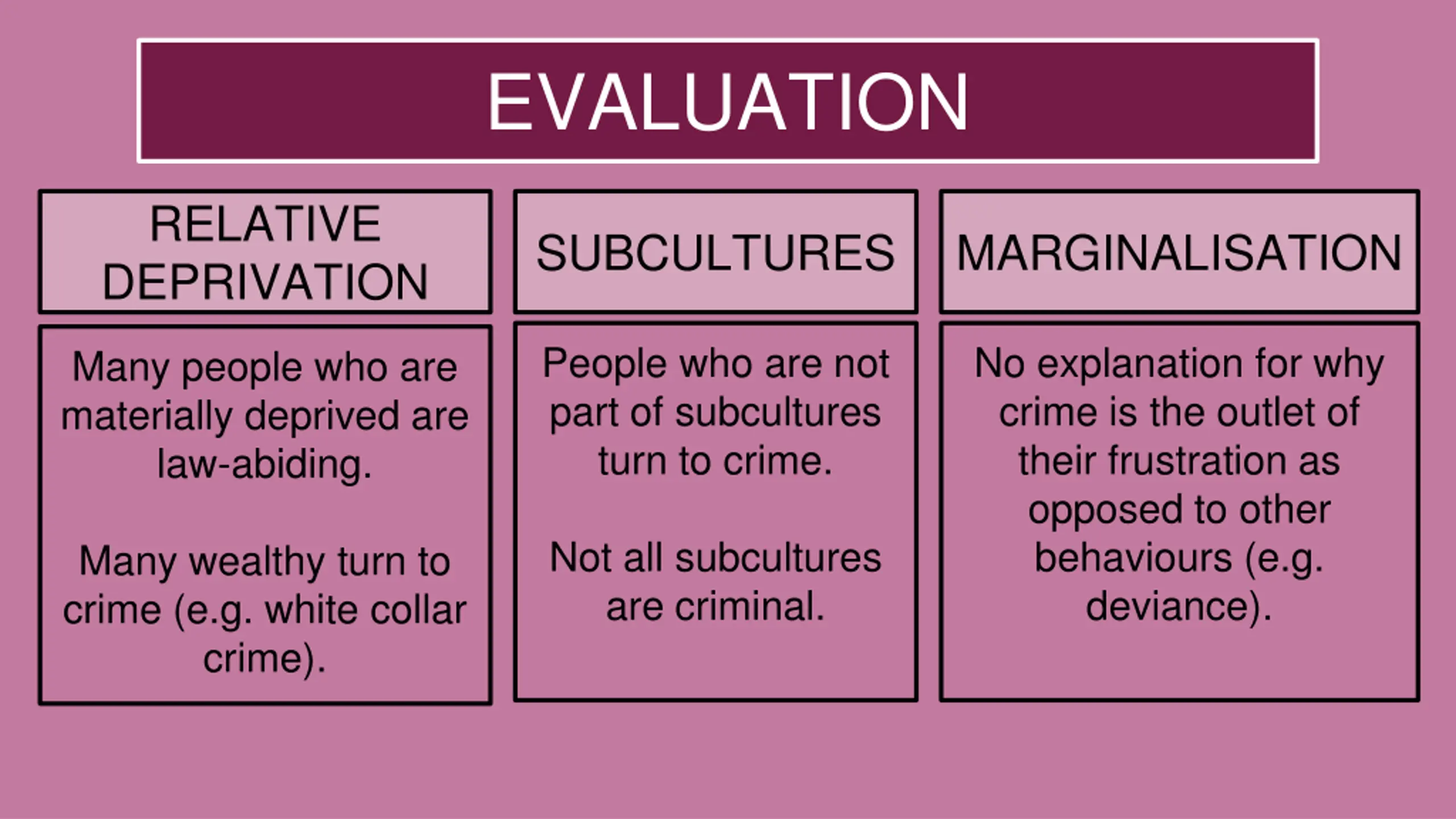 EVALUATION RELATIVE DEPRIVATION SUBCULTURES MARGINALISATION People who are not part of subcultures turn to crime. No explanation for why crime is the outlet of their frustration as opposed to other behaviours (e.g. deviance). Many people who are materially deprived are law-abiding. Not all subcultures are criminal. Many wealthy turn to crime (e.g. white collar crime).