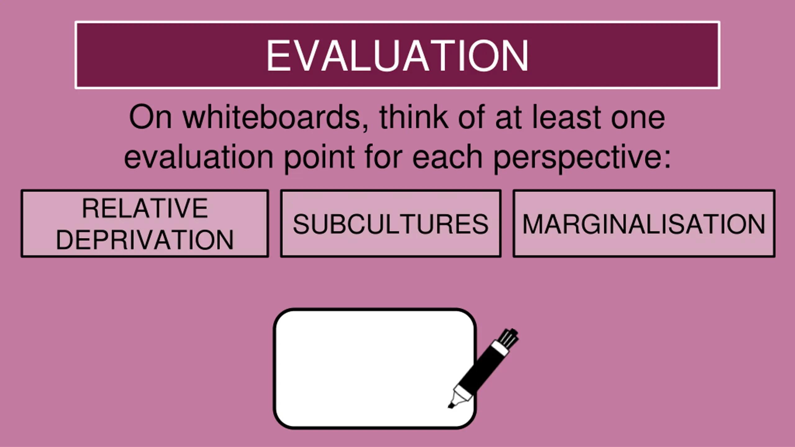 EVALUATION On whiteboards, think of at least one evaluation point for each perspective: RELATIVE DEPRIVATION SUBCULTURES MARGINALISATION