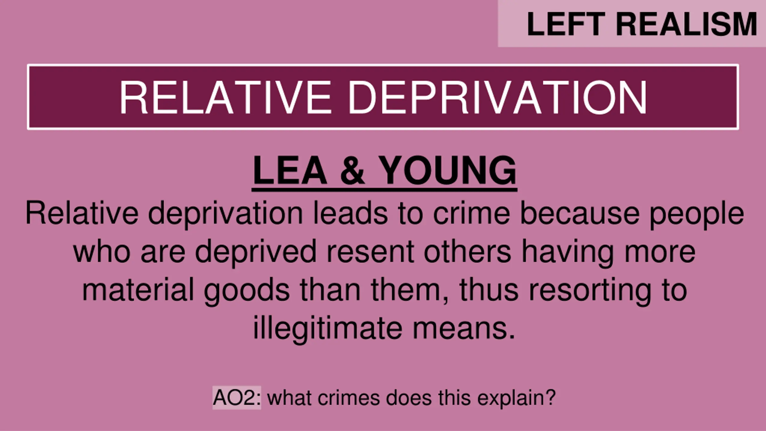 LEFT REALISM RELATIVE DEPRIVATION LEA & YOUNG Relative deprivation leads to crime because people who are deprived resent others having more material goods than them, thus resorting to illegitimate means. AO2: what crimes does this explain?